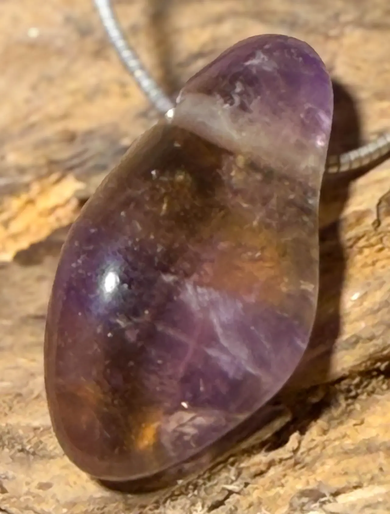 Ein eleganter Edelstein-Schmuckanhänger aus Ametrin, gefertigt aus einem sorgfältig polierten Trommelstein. Der Ametrin vereint die Farben von Amethyst und Citrin in einem faszinierenden Farbverlauf – zarte Violett- und Goldtöne verschmelzen harmonisch und machen jedes Stück zu einem einzigartigen Naturkunstwerk.