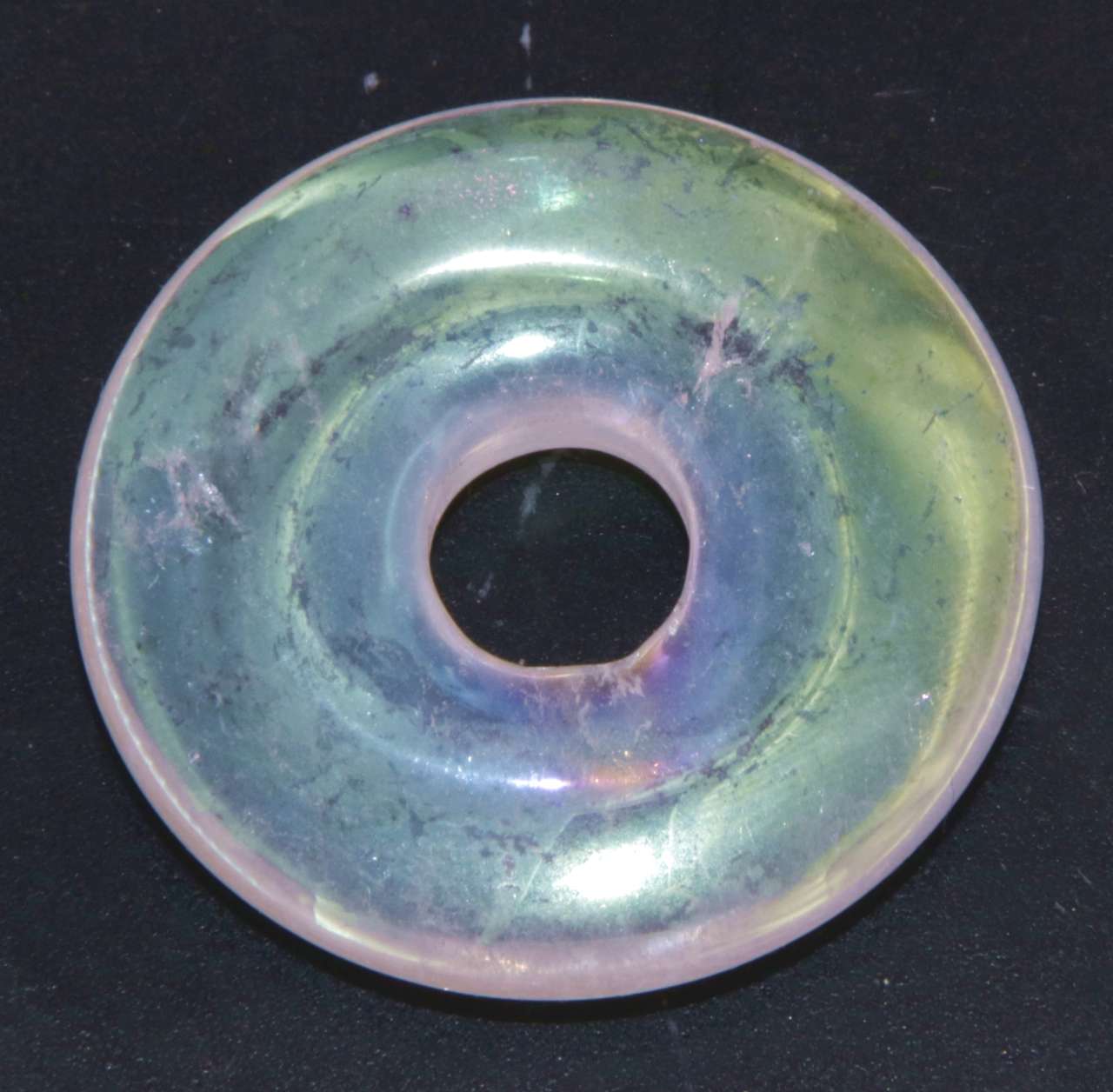 Die klassische Donutform (Pi-Scheibe) steht für Harmonie, Vollkommenheit und Ausgeglichenheit. In Kombination mit der zarten, regenbogenartigen Oberfläche des Angel Aura Quarzes entsteht ein eleganter Energie-Donut, der Leichtigkeit, Reinheit und zeitlose Eleganz ausstrahlt.