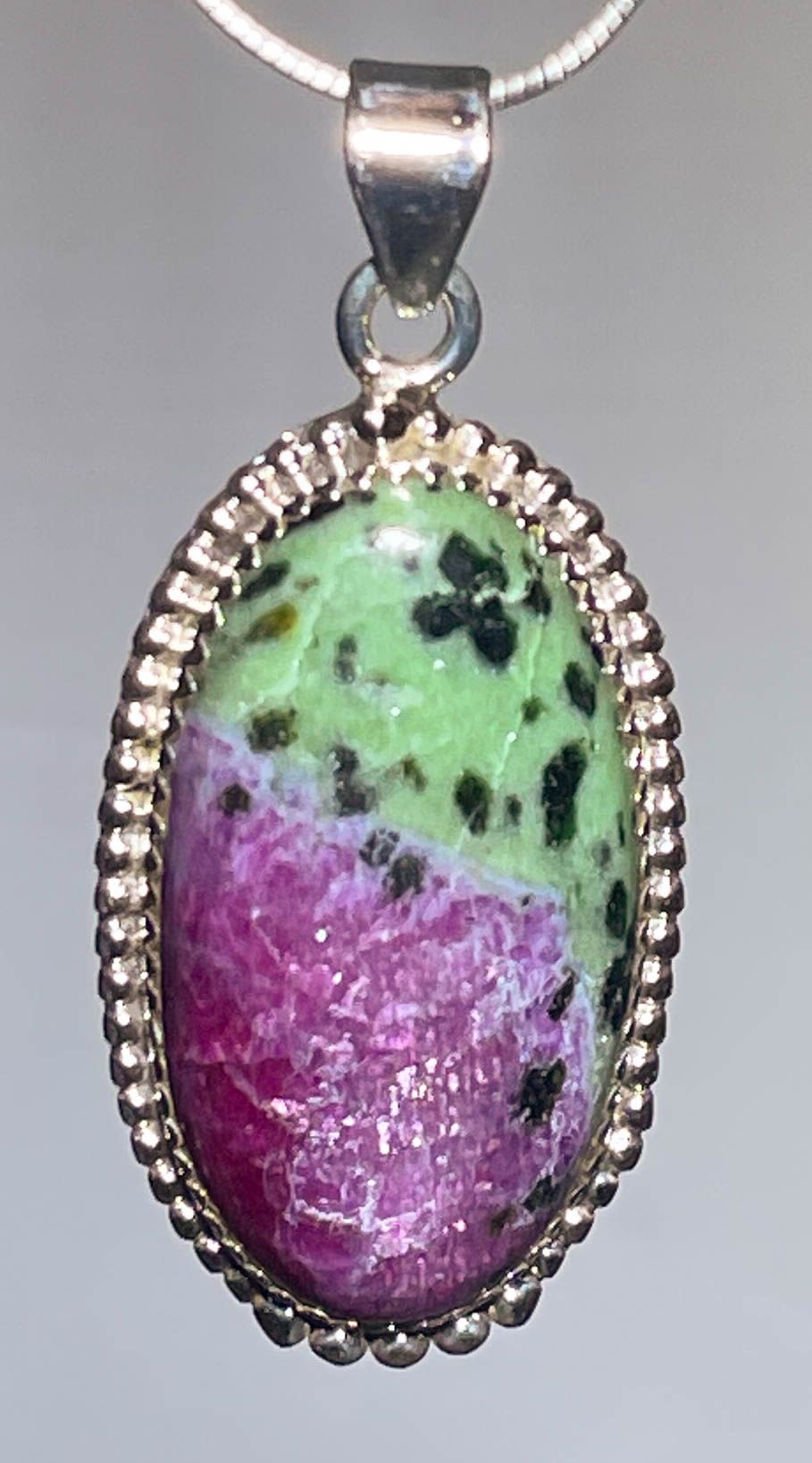 Dieser edle Edelstein-Anhänger aus Rubin-Zoisit fasziniert durch seine natürliche Farbvielfalt und energetische Ausstrahlung. Das Zusammenspiel aus kräftigem Grün und leuchtendem Rubinrot symbolisiert die Vereinigung von Herzenergie und Lebensfreude – ein Ausdruck von Kraft, Liebe und innerer Balance.