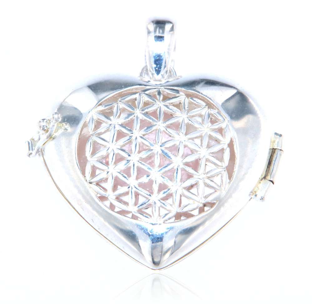 Das Medaillon lässt sich seitlich durch einen kleinen Bügel öffnen, sodass im Inneren ein Herzstein oder kleiner Erinnerungsstein sicher aufbewahrt werden kann. Durch die zarte Ornamentik bleibt der Stein sichtbar – geschützt, aber doch im Mittelpunkt.