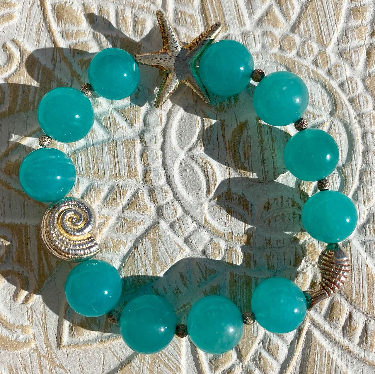 Ein Armband aus Amazonit Edelsteinen, das durch seine sanft türkisfarbene Ausstrahlung besticht. Jeder Stein ist ein einzigartiges Naturunikat und auf ein reißfestes Gummiband aufgefädelt, wodurch sich das Armband bequem und flexibel dem Handgelenk anpasst. Alle Zwischenteile bestehen aus 925er Silber.