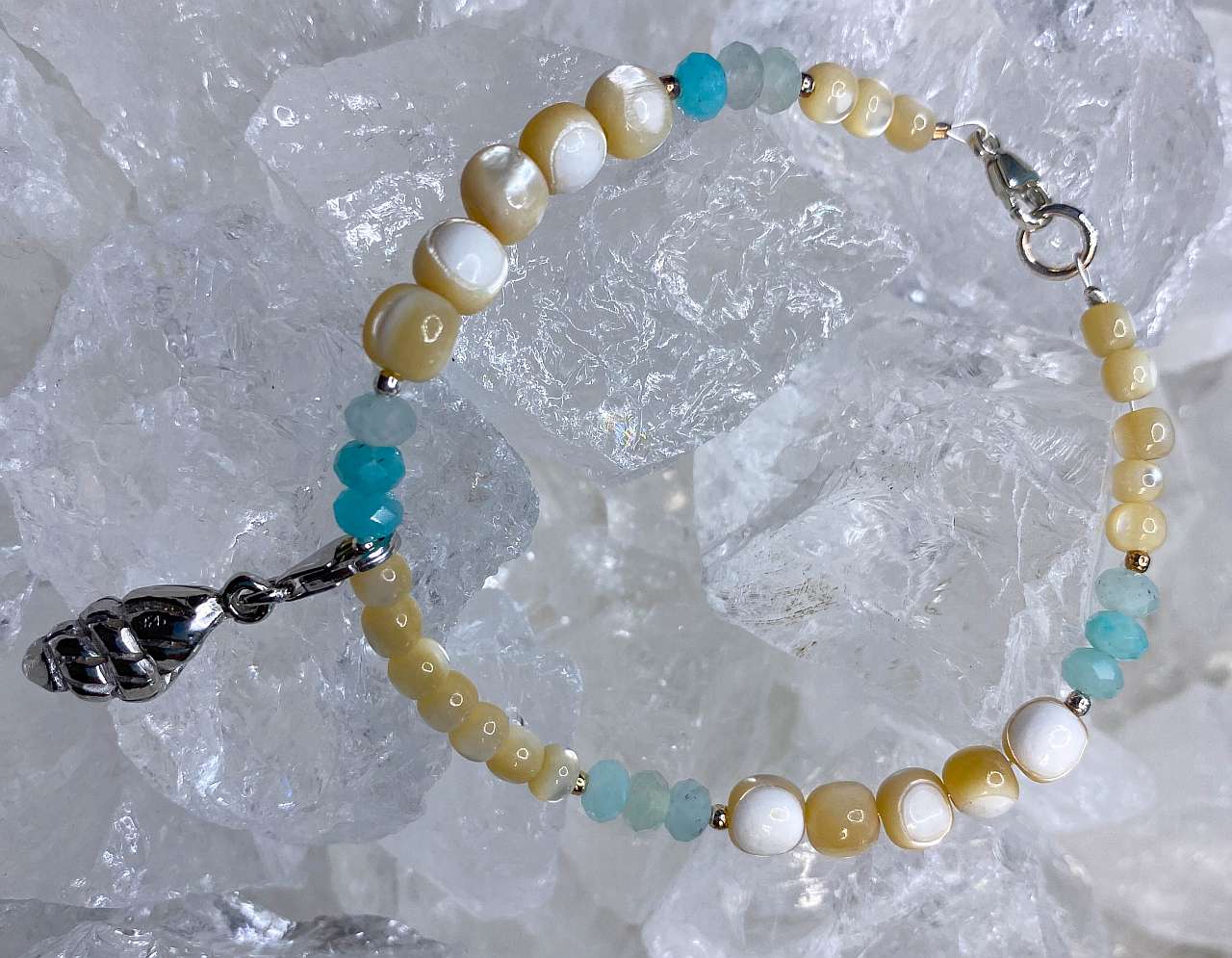 Du erhältst das abgebildete Amazonit-Muschel Armband – handverlesen, individuell und einzigartig.