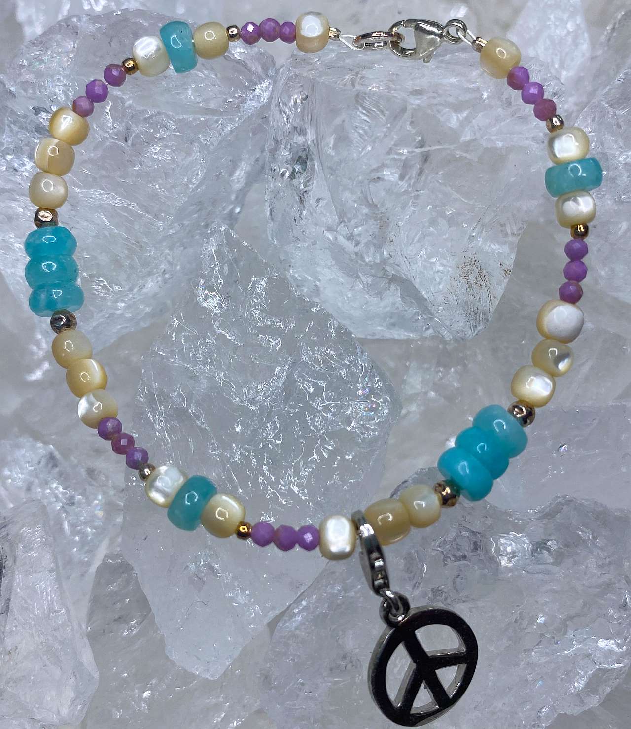 Ein harmonisches Zusammenspiel aus Amazonit, facettiertem Phosphosiderit und Muschelkernperlen verleiht diesem Armband eine sanfte, edle Ausstrahlung. Der Peace-Charm-Anhänger aus 925er Silber setzt ein stilvolles Statement für Gelassenheit und Ausgeglichenheit. Die Edelsteine sind auf einem reißfesten Silberdraht aufgezogen, wodurch sich das Armband perfekt an das Handgelenk anschmiegt.