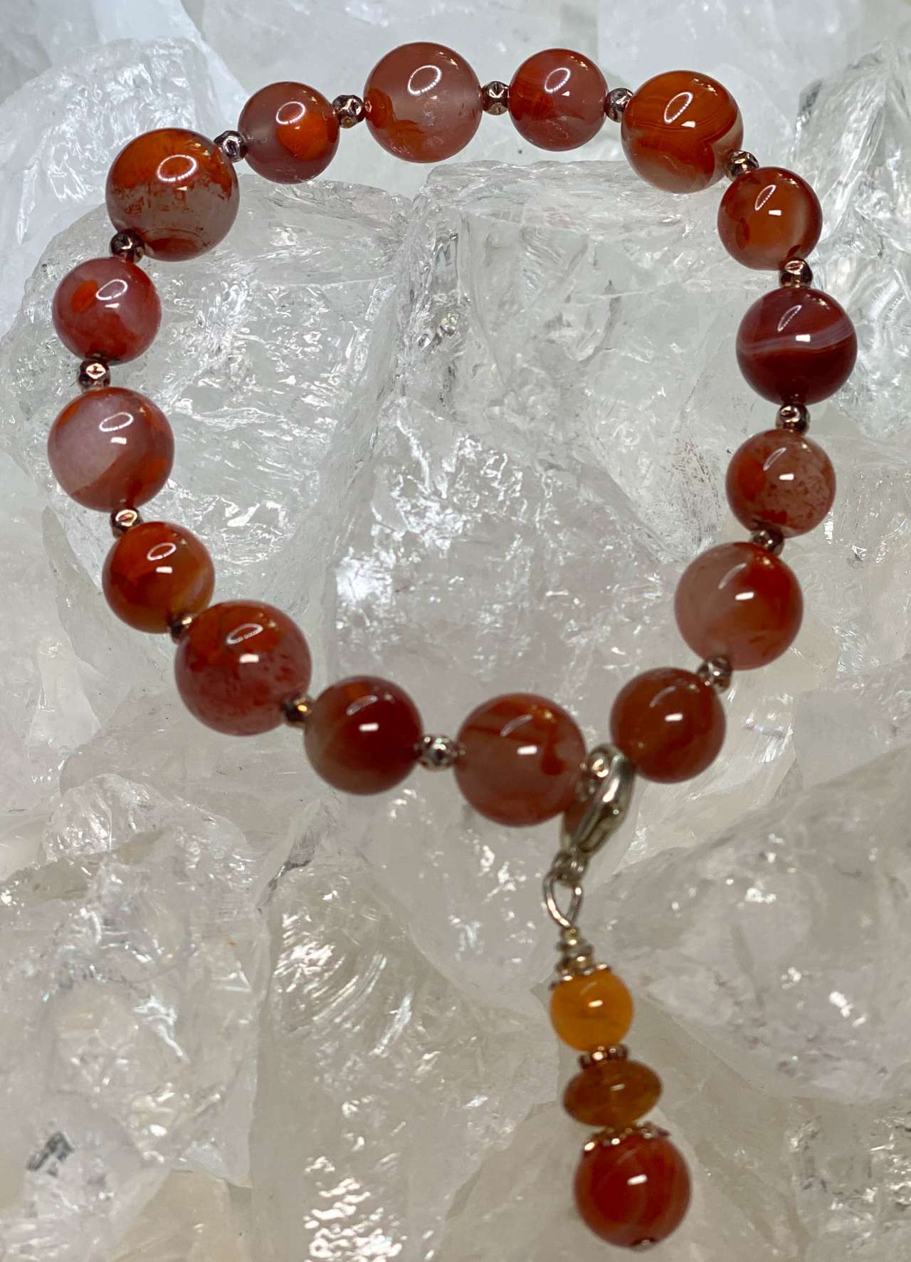 Dieses wunderschöne Edelsteinarmband vereint die warme Ausstrahlung von Blutchalcedon und Karneol zu einem einzigartigen Schmuckstück. Die Edelsteine sind auf ein reißfestes Gummiband aufgefädelt, das sich flexibel an das Handgelenk anpasst und höchsten Tragekomfort bietet. Ein Engel-Anhänger mit Karabiner sorgt für einen besonderen Blickfang.