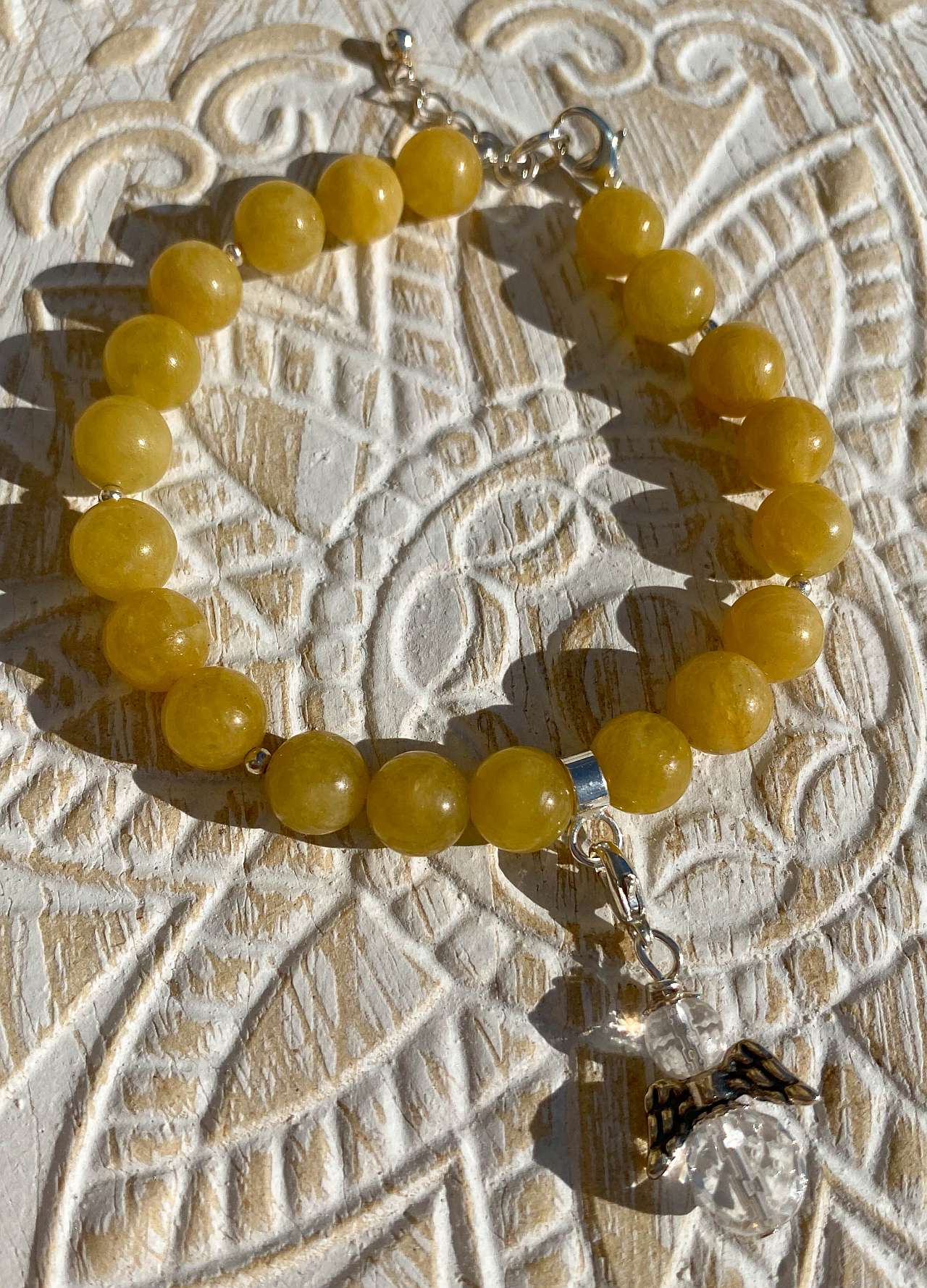 Dieses exquisite Armband aus Honigopal besticht durch seine warmen, goldgelben Farbtöne, die an Sonnenlicht erinnern und eine besonders edle Ausstrahlung verleihen. Der zarte Engel aus facettiertem Bergkristall fungiert als stilvoller Karabineranhänger und verleiht dem Schmuckstück eine symbolische Note von Schutz und Reinheit.
