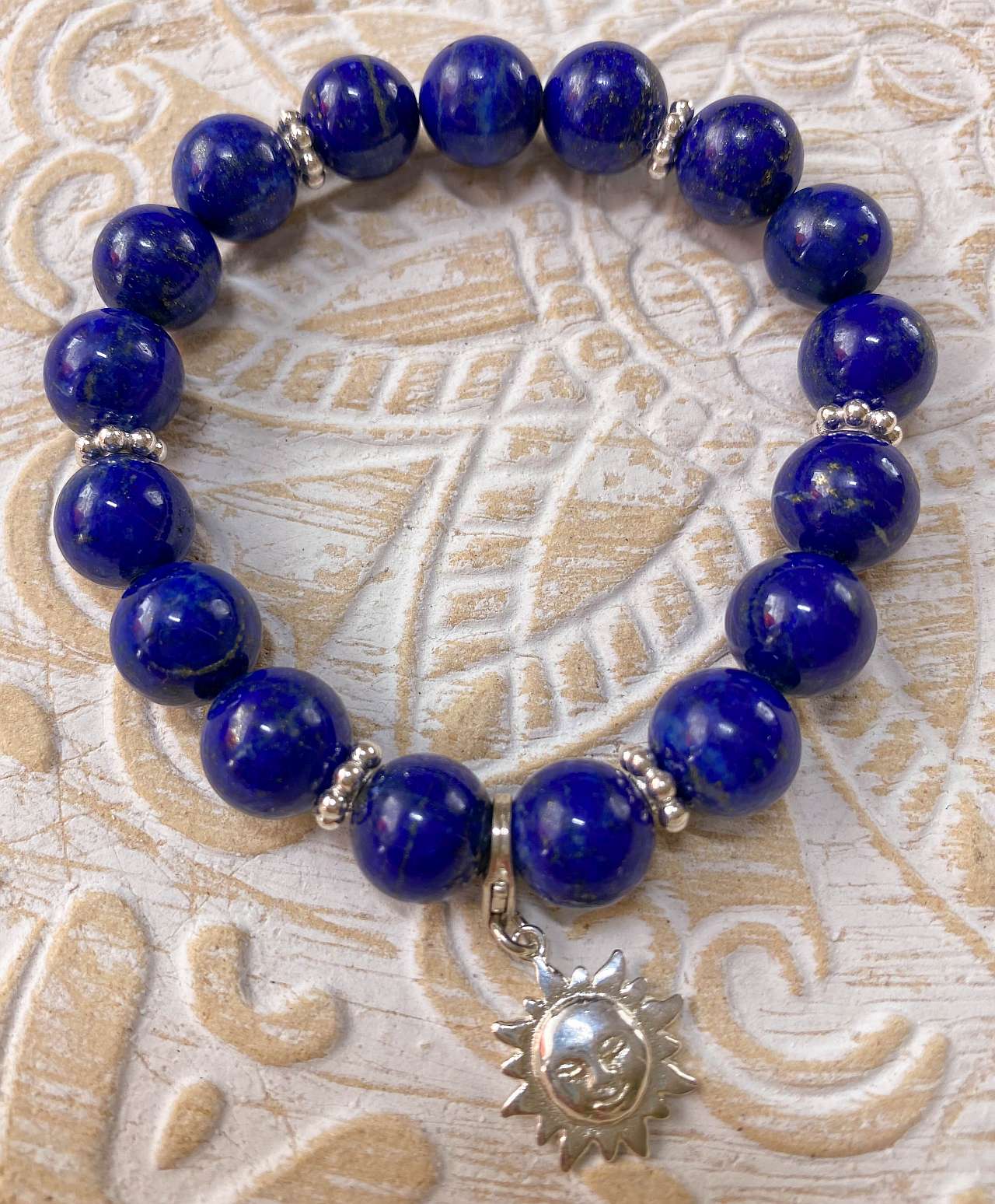Ein wunderschönes, handgefertigtes Armband aus tiefblauen Lapislazuli Edelsteinen, das jedem Outfit einen Hauch von Eleganz verleiht. Der harmonisch gearbeitete Sonnen-Anhänger aus 925er Silber setzt dabei einen strahlenden Akzent.