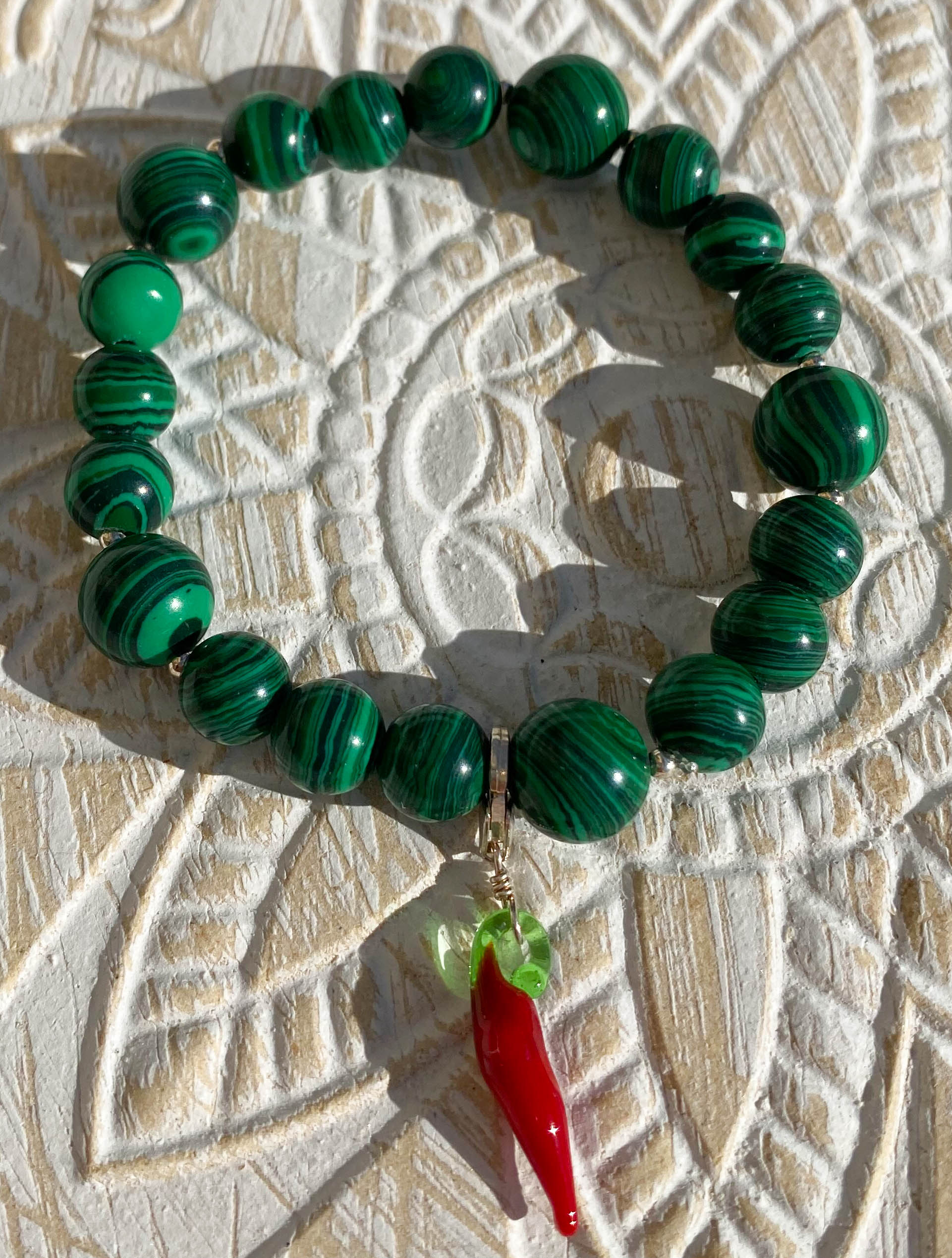 Malachit Edelstein Armband – Chilli Karabiner Charm – 925er Silber, handgefertigtes Unikat