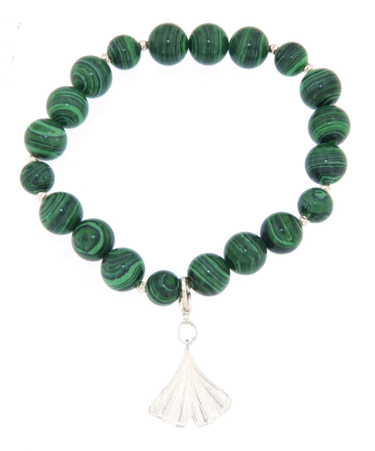 Dieses edle Armband kombiniert Malachit Edelsteine mit einem Ginkgo Blatt Karabiner Charm aus 925er Silber, der sich einfach austauschen lässt. Die Edelsteine sind auf einem starken, reißfesten Gummiband aufgefädelt, wodurch sich das Armband perfekt dem Handgelenk anpasst. Alle Zwischenteile bestehen aus 925er Silber, was dem Schmuckstück einen besonders hochwertigen Look verleiht.