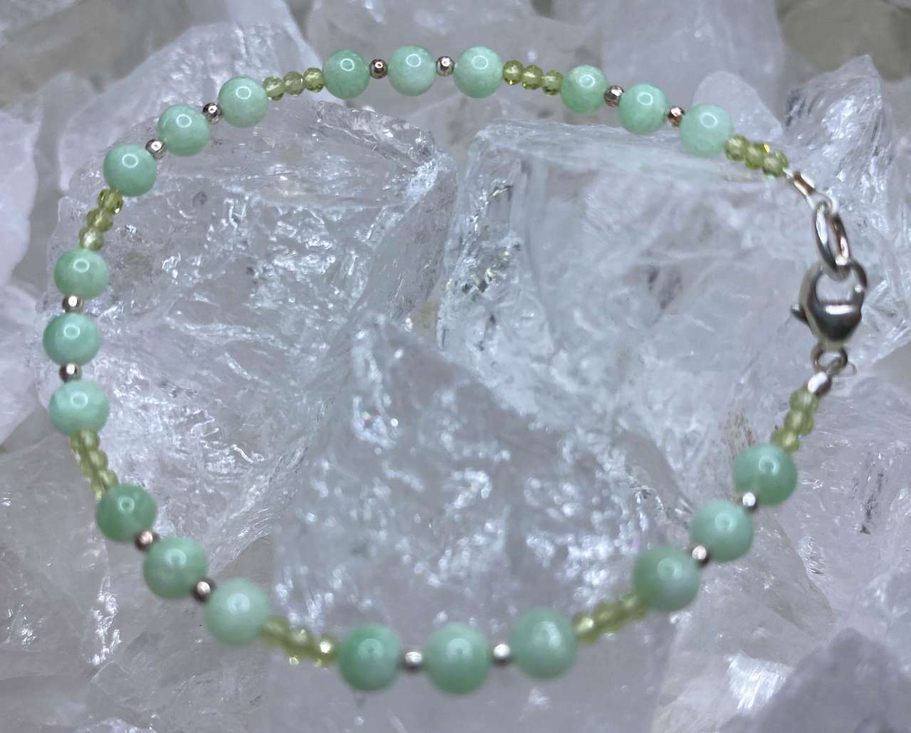 Dieses edle Armband vereint die sanfte Schimmerkraft des grünen Mondsteins mit dem lebendigen Glanz des facettierten Peridots. Die Kombination dieser beiden Edelsteine symbolisiert Harmonie, Wachstum und innere Balance – ein Schmuckstück, das Eleganz und positive Energie perfekt vereint.