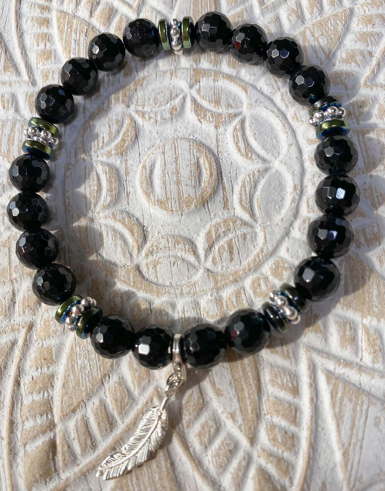 Dieses elegante Edelsteinarmband kombiniert die tiefschwarze Ausstrahlung des facettierten schwarzen Turmalins (Schörl) mit den glänzenden Akzenten von Hämatin-Kugeln und einem stilvollen Feder-Anhänger-Charm. Die Edelsteine sind auf einem flexiblen, reißfesten Gummiband aufgefädelt, sodass sich das Armband perfekt an das Handgelenk anschmiegt und angenehm zu tragen ist.