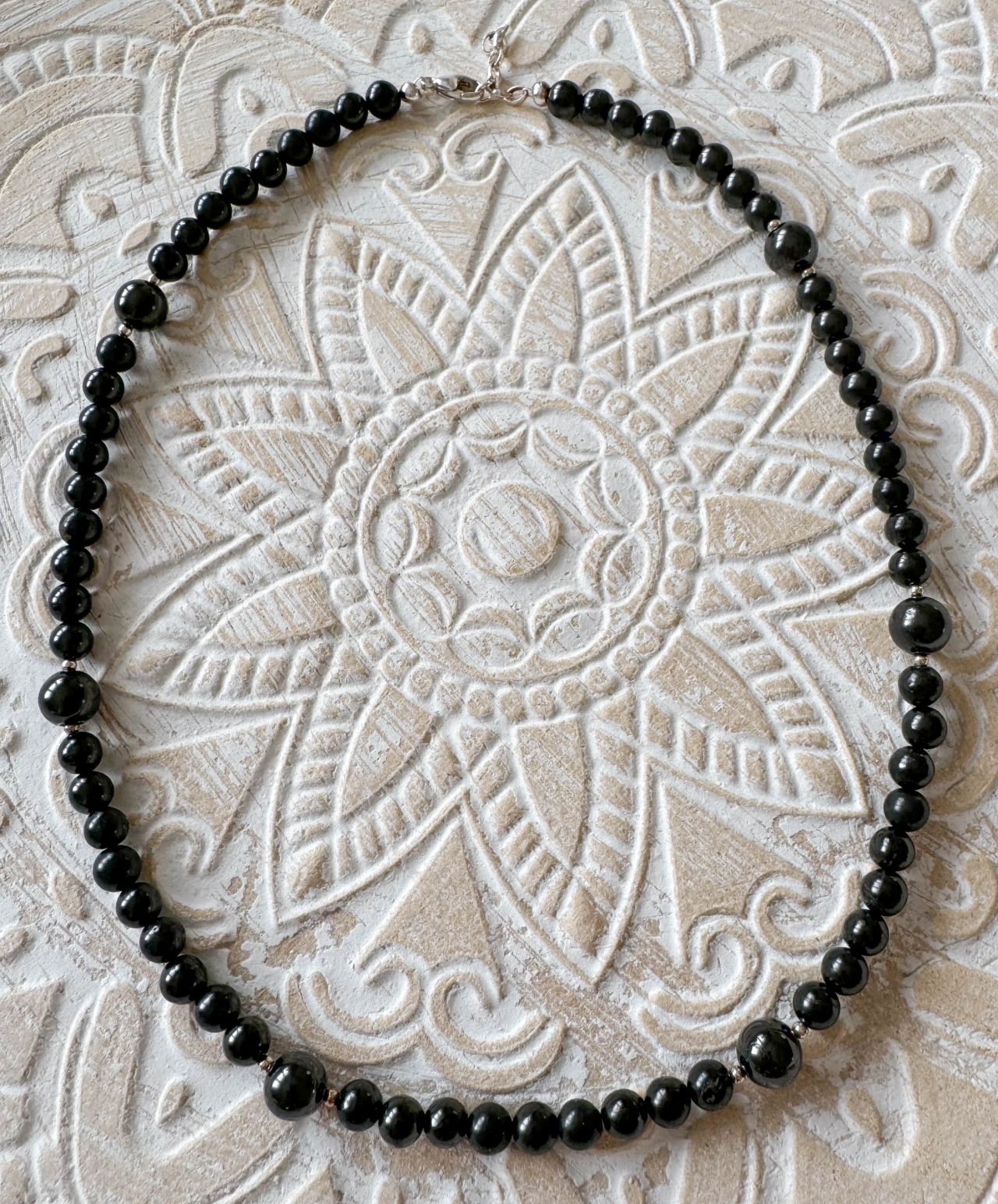 Dieses edle handgefertigte Edelstein-Collier aus schwarzem Turmalin (Schörl) vereint kraftvolle Energie mit zeitloser Schönheit. Die Edelsteine in Größen von 6 und 8 mm bestechen durch ihren tiefschwarzen Glanz und ihre schlichte, edle Ausstrahlung. Der schwarze Turmalin gilt als Schutzstein, der negative Energien abwehrt und innere Stabilität verleiht.
