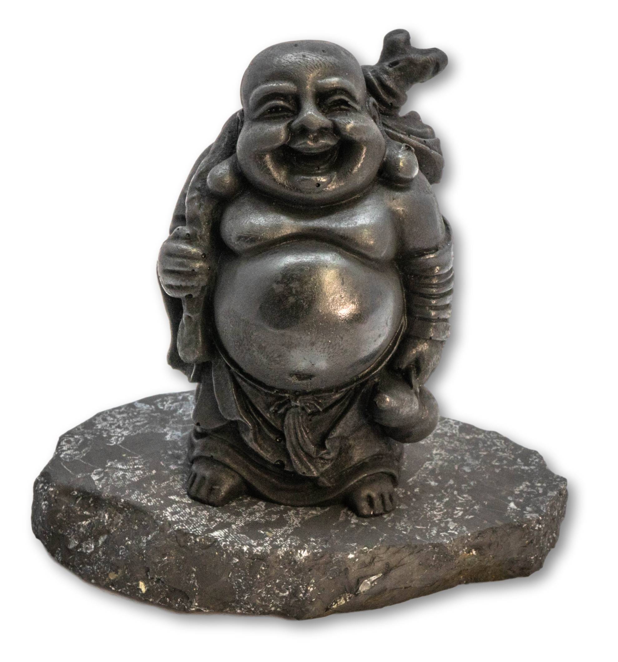 Eine kunstvoll gearbeitete Hotei-Figur (Der Lachende Buddha) aus edlem Schungit, gefertigt mit einem hohen Anteil an natürlichem Schungitpulver.