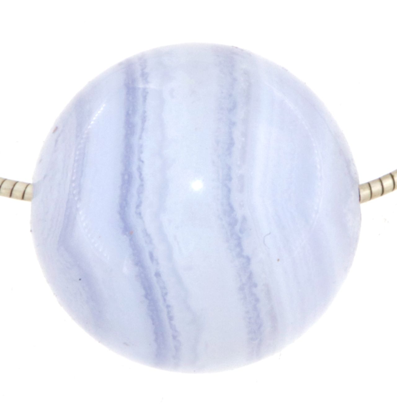 Dieser zarte Kugel-Anhänger aus blauem Chalcedon besticht durch seine sanfte, himmelblaue Farbgebung und den seidigen Glanz des fein polierten Edelsteins.