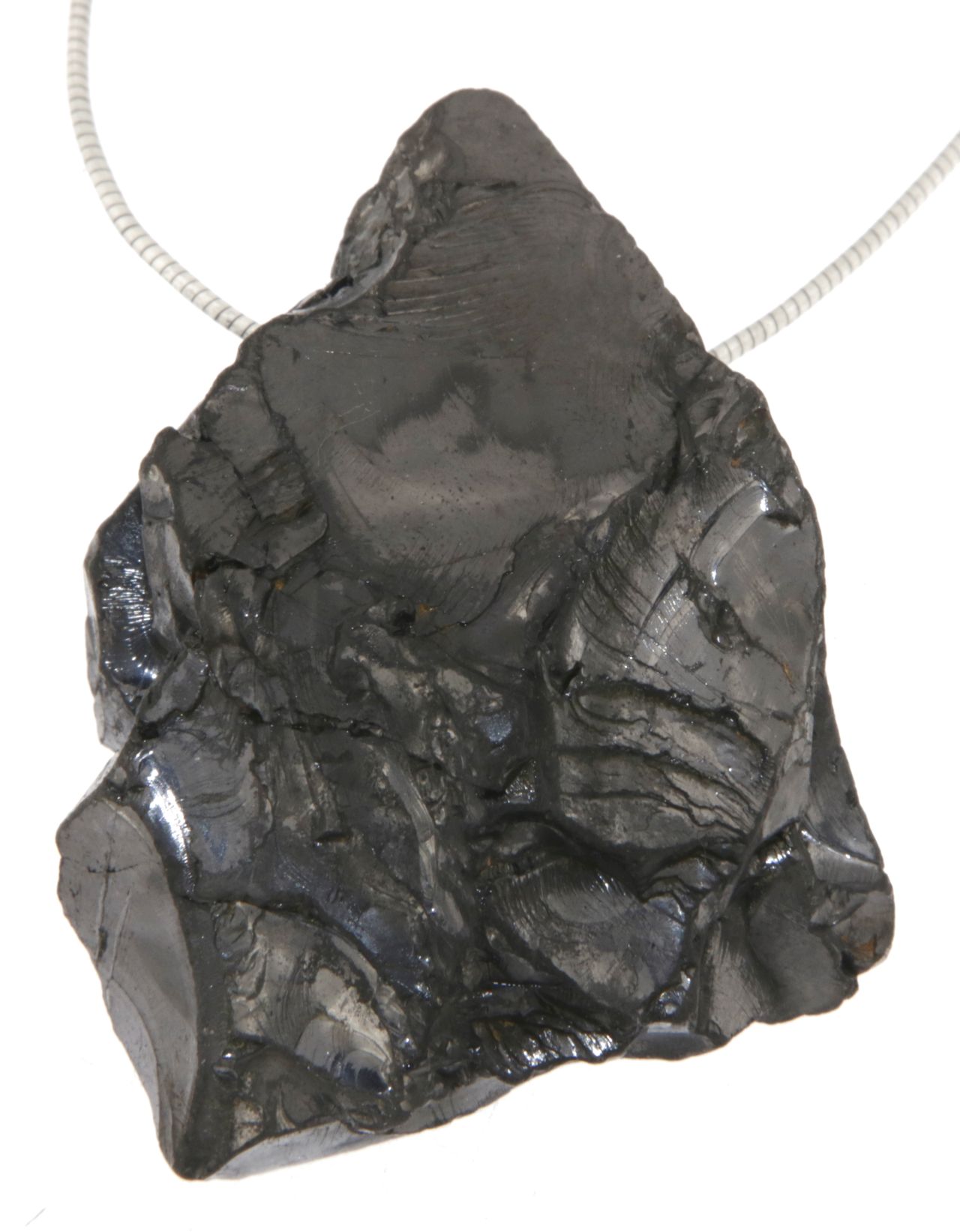 Ein edler Edelsteinanhänger aus echtem Edelschungit, handverarbeitet und sorgfältig poliert, um den tiefschwarzen, metallischen Glanz dieses außergewöhnlichen Natursteins hervorzuheben.
