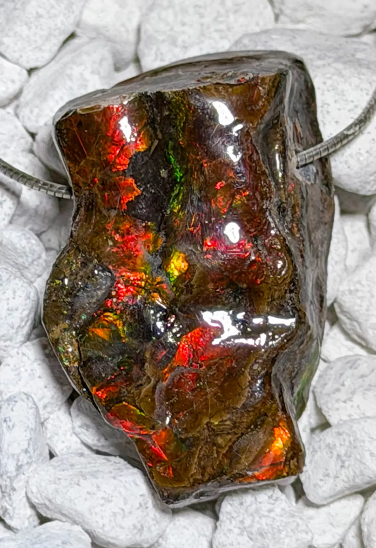 Ein beeindruckender Edelsteinanhänger aus Ammolit, einem der seltensten organischen Edelsteine der Welt. Dieses außergewöhnliche Fossil zeigt ein faszinierendes Farbspiel – von leuchtendem Rot über Grün bis hin zu schimmerndem Blau, je nach Lichteinfall. Jeder Ammolit ist ein unverwechselbares Naturunikat, dessen Struktur und Farben Millionen Jahre Erdgeschichte widerspiegeln. Ein elegantes Schmuckstück voller Intensität und Ausdruckskraft.