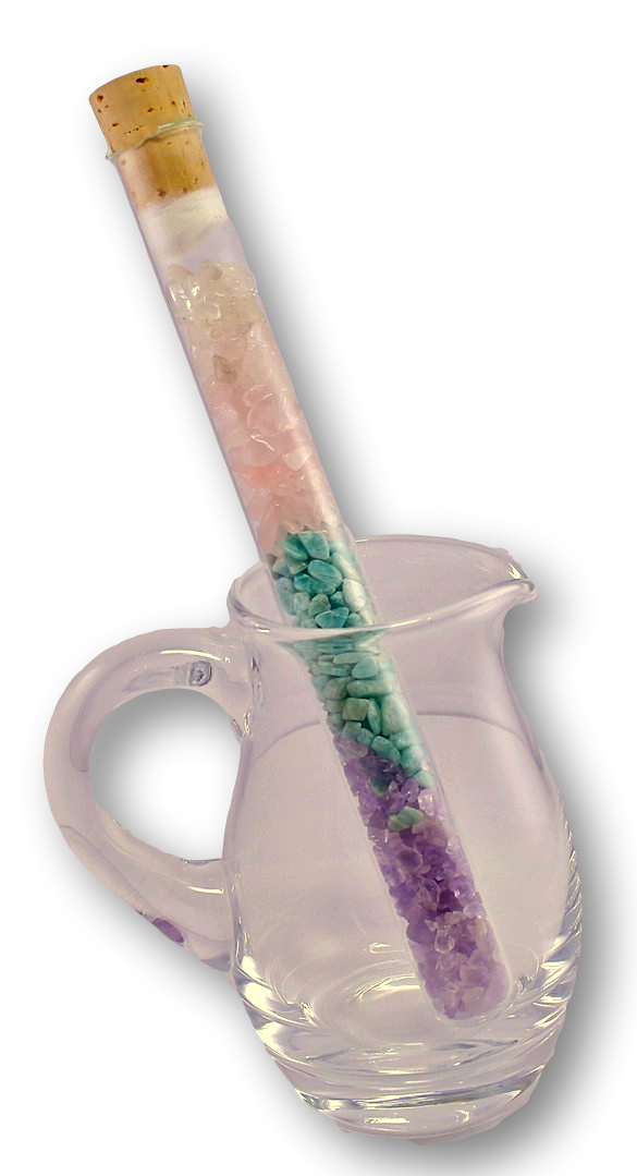 Die Edelsteine liegen im Reagenzglas, das im Glaskrug / Glas steht. Nach ca. 12 Stunden kann das Wasser getrunken werden. Besonders gut eignen sich kleine Edelsteine für diese Methode.