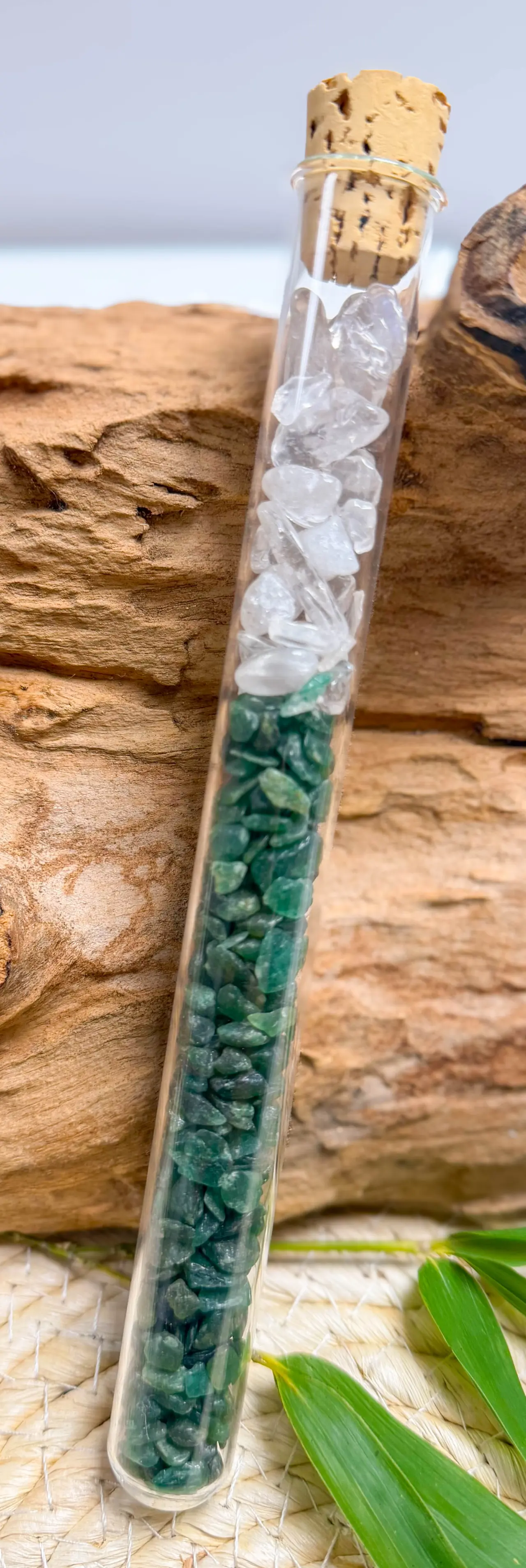 Sie können rohe, unpolierte oder geschliffene Edelsteine nutzen. Wir empfehlen kleine Steine und ein Reagenzglas.