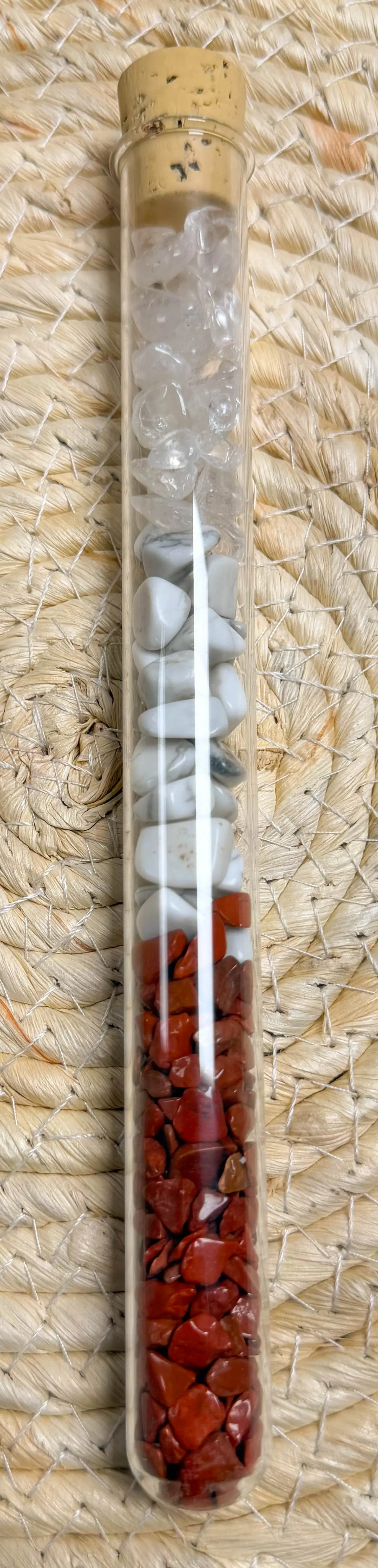 Diese gezielte Mischung aus rotem Jaspis, Magnesit (Howlith) und Bergkristall fördert Vitalität, Ruhe und Ausgeglichenheit: