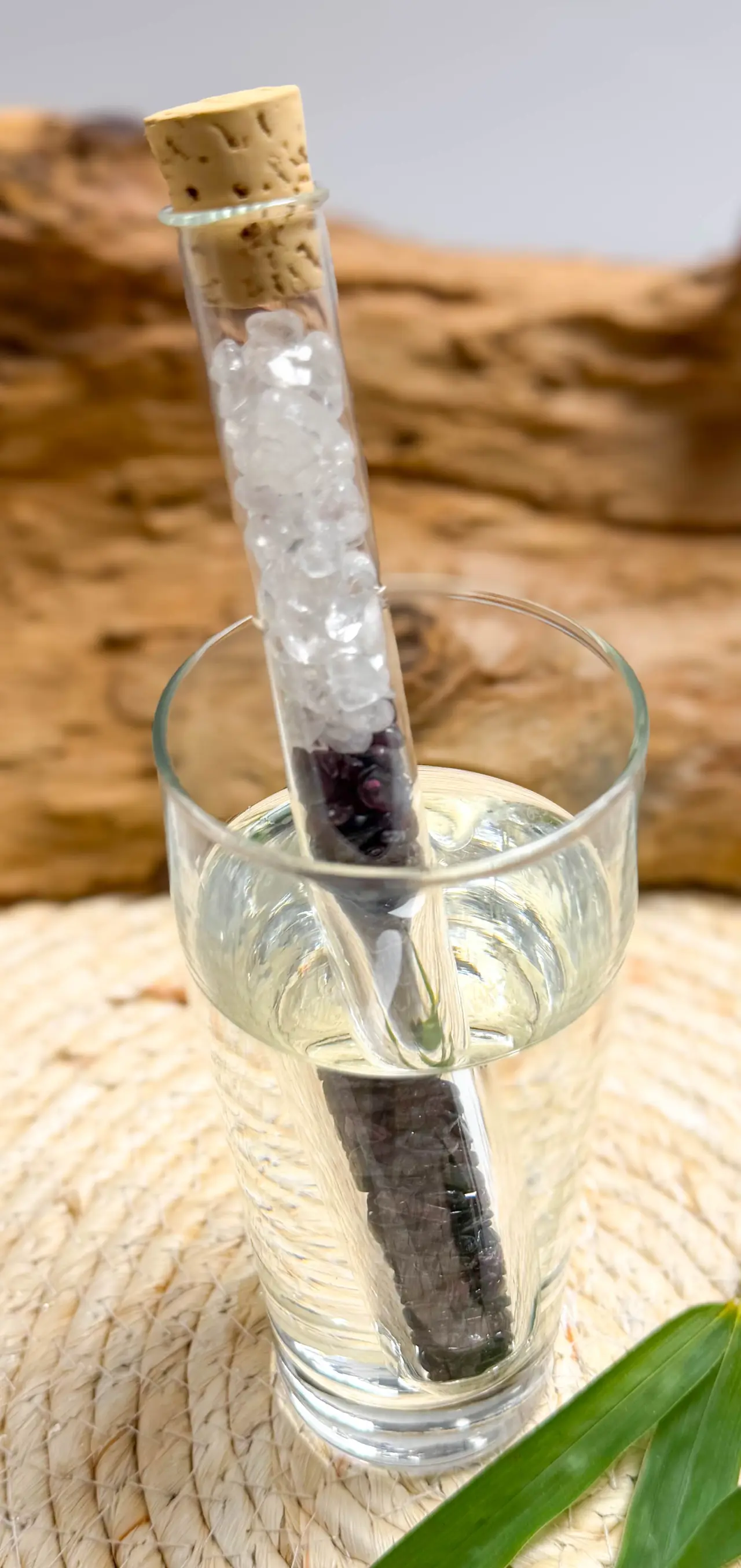 Das mit Edelsteinen gefüllte Reagenzglas wird einfach in den Glaskrug oder das Trinkgefäß gestellt – ohne direkten Kontakt der Steine mit dem Wasser. Nach etwa 12 Stunden ist das Wasser energetisiert und trinkfertig. Diese Methode eignet sich auch für empfindliche oder poröse Steine, die nicht direkt ins Wasser gelegt werden sollten.