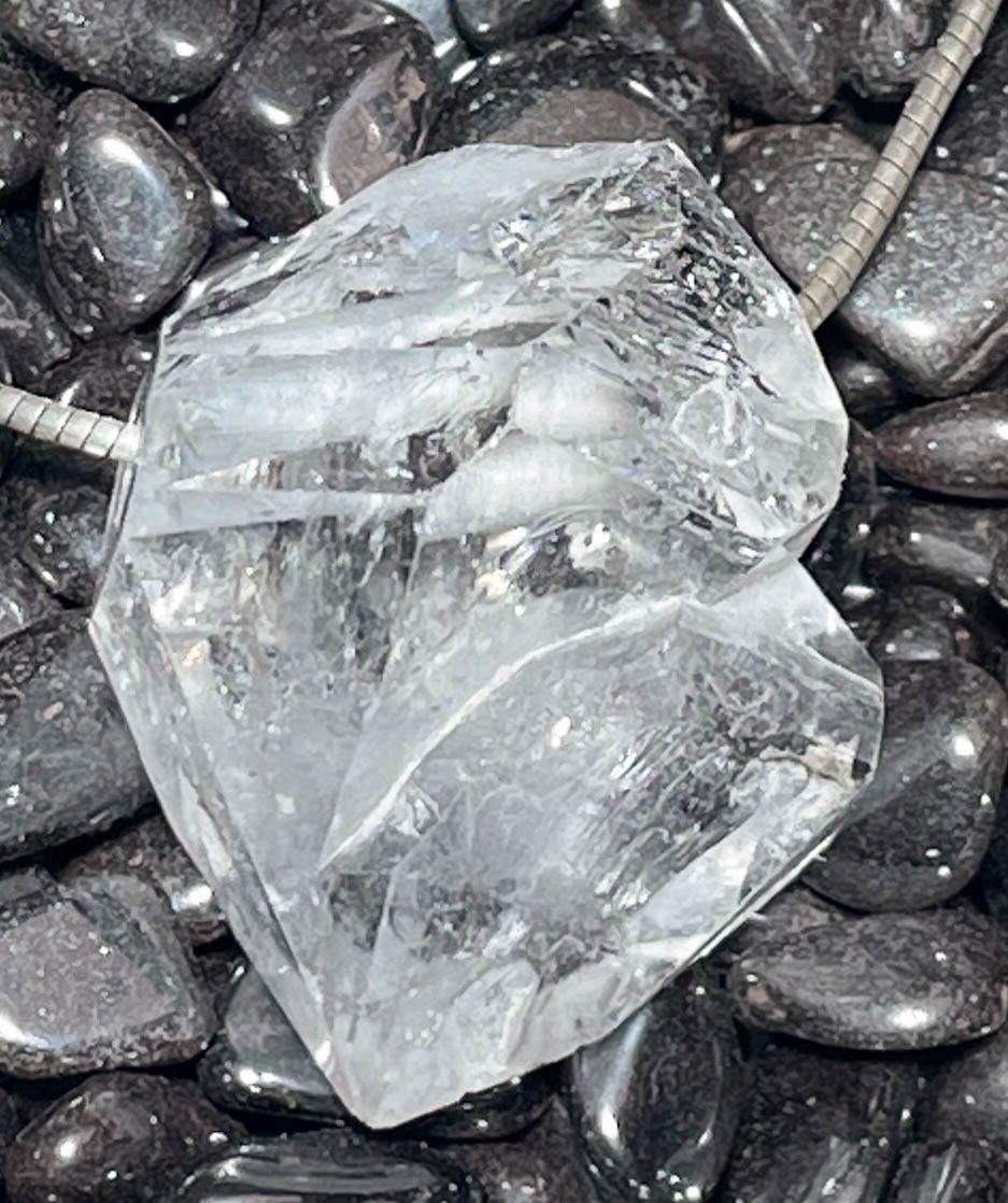 Ein besonderer Trommelstein-Anhänger aus Herkimer „Diamant“ Quarz mit feinen Turmalin-Einschlüssen – ein faszinierendes Zusammenspiel aus kristallklarer Reinheit und dunklen, natürlichen Strukturen. Der Edelstein strahlt eine außergewöhnliche Klarheit aus, während die Turmalinadern ihm eine unverwechselbare Tiefe und Ausdruckskraft verleihen. Jeder Anhänger ist ein individuelles Naturunikat.