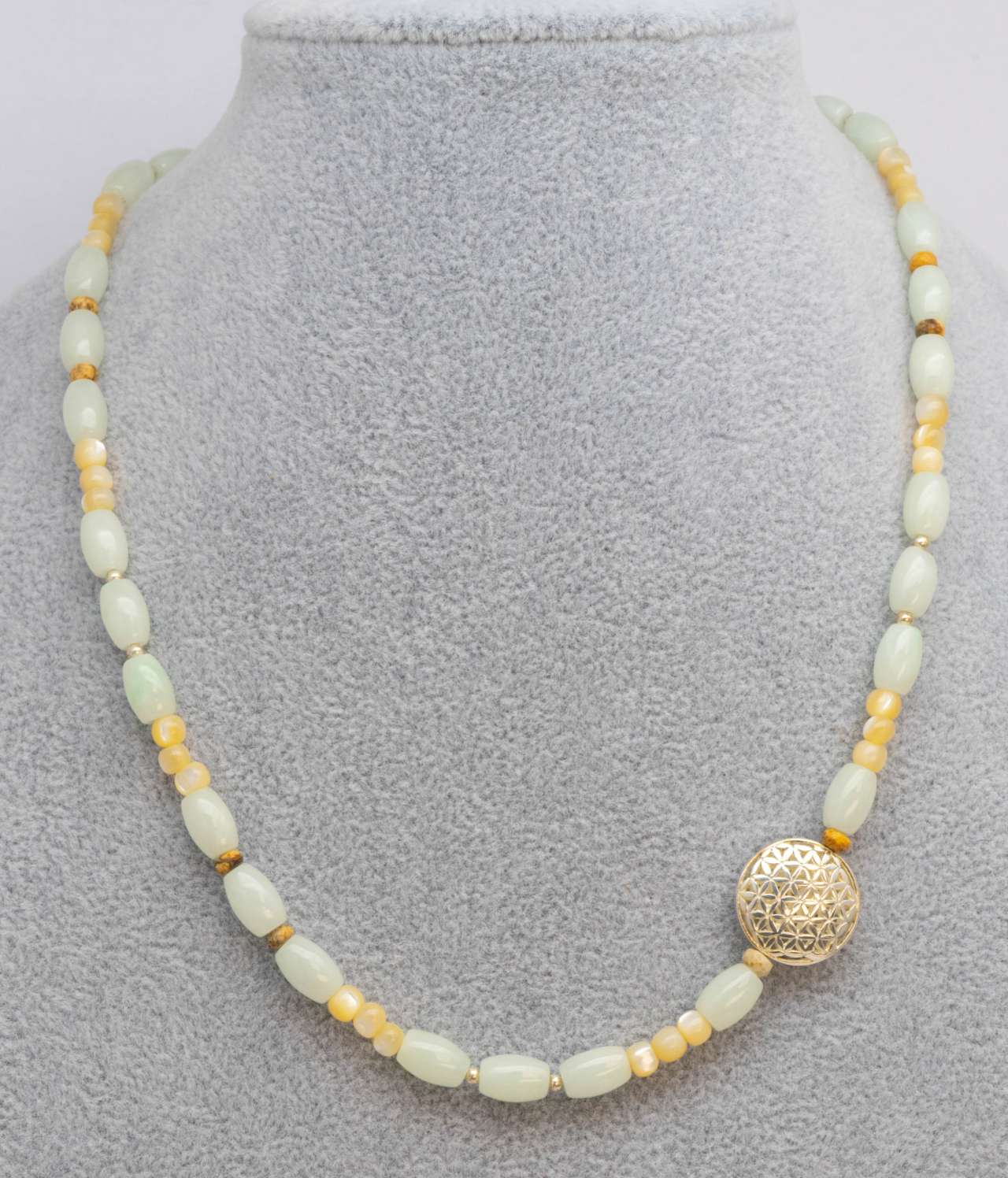 Ein Schmuckstück voller natürlicher Schönheit und sanfter Harmonie: Dieses handgefertigte Edelstein-Collier aus Burma Jade, Muschelperlen und Landschaftsjaspis verbindet warme Erdtöne mit zartem Perlglanz und der spirituellen Symbolik der Blume des Lebens. Die edle Kombination steht für Ausgleich, Natürlichkeit und inneren Frieden – ein Collier, das Leichtigkeit und Stärke zugleich ausstrahlt.