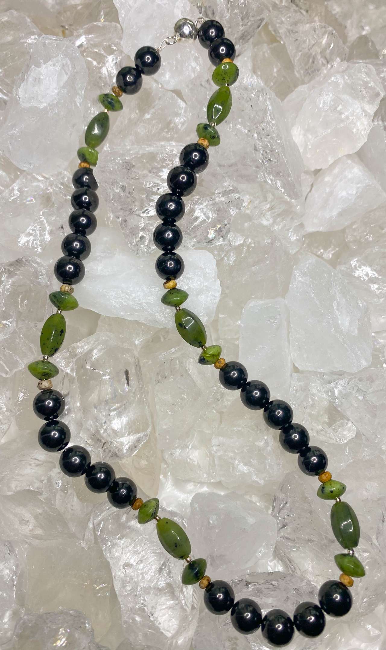 Dieses liebevoll handgefertigte Edelstein-Collier kombiniert die beruhigenden Grüntöne der Kanada-Jade mit dem tiefen, mystischen Schwarz des Schungits und den erdigen, warmen Nuancen des Landschaftsjaspis.