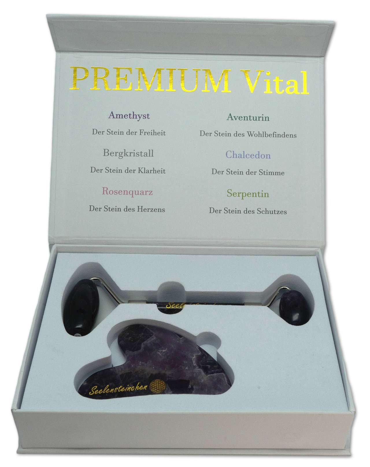 Startseite » EDELSTEIN LEXIKON A-Z » AMETHYST » Amethyst PREMIUM Vital Massage Set Crystal Roller + Gua Sha - Guasha - Edelsteinroller - Jade - Gesichtsroller