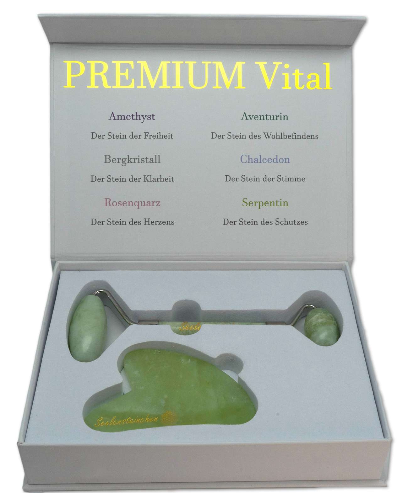 Startseite » EDELSTEIN LEXIKON A-Z » JADE » Serpentin PREMIUM Vital Massage Set Crystal Roller + Gua Sha - Guasha - Edelsteinroller - Jade - Gesichtsroller