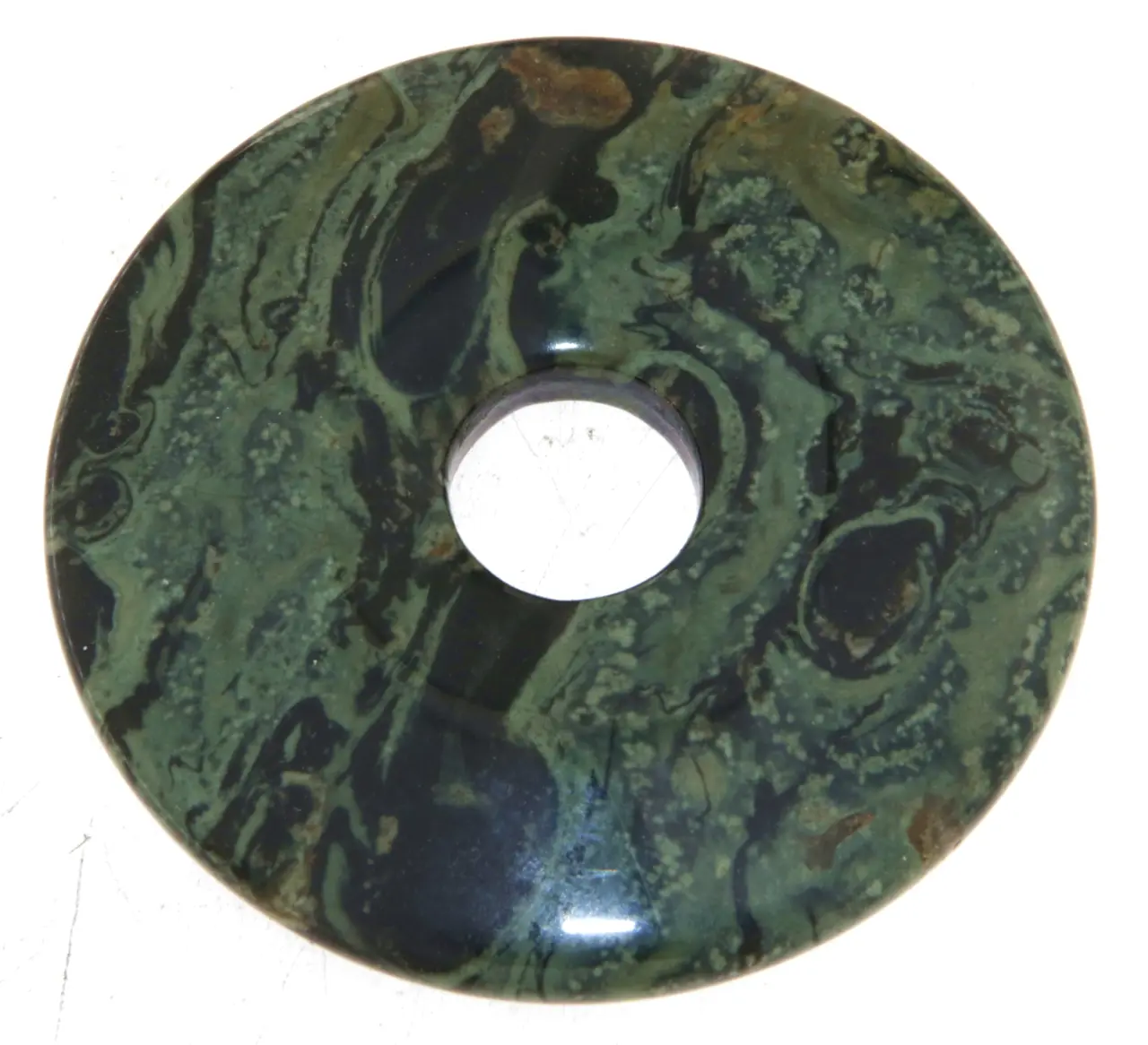 Die klassische Donutform (Pi-Scheibe) steht für Harmonie, Vollkommenheit und Ausgeglichenheit. In Verbindung mit der markanten Struktur des Schlangenjaspis entsteht ein ausdrucksstarker Energie-Donut, der Natürlichkeit und Eleganz in sich vereint.