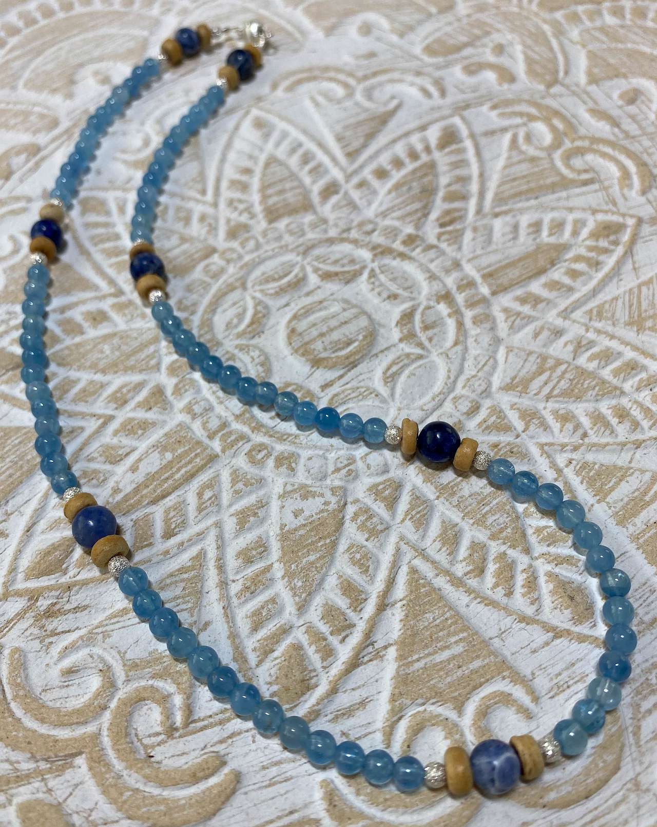Lieferumfang: Abgebildetes Collier aus Sodalith, Aquamarin & Kokosnussholz