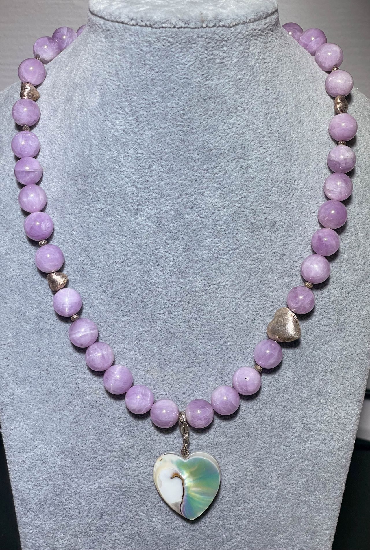 Edelstein-Collier aus Kunzit mit Muschelherz – handgefertigt mit 925er Silber