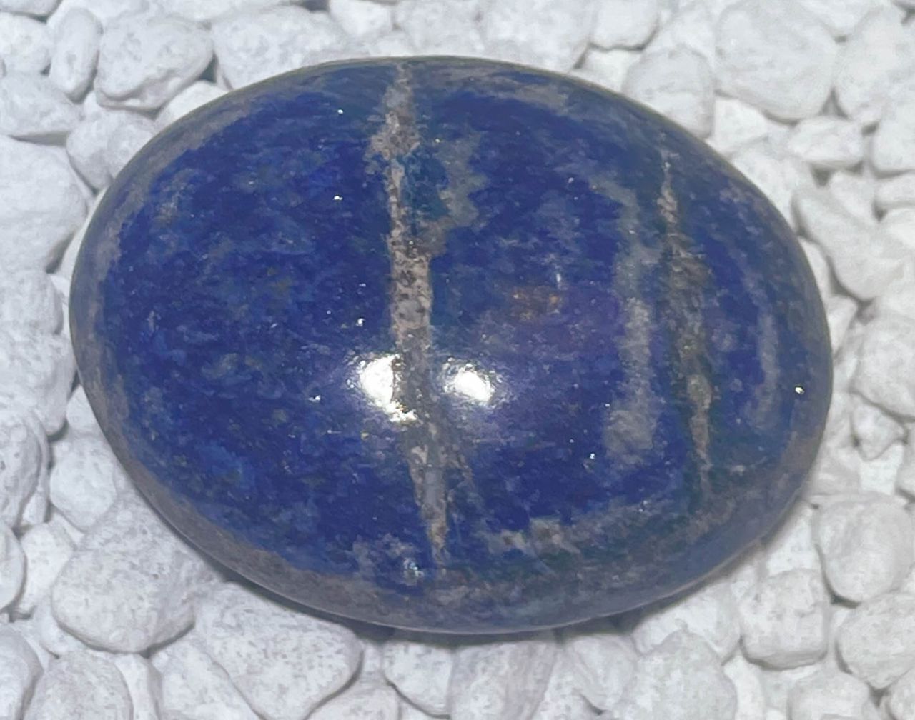 Ein edler Lapislazuli Seifenstein in A-Qualität, fein geschliffen und poliert. Der tiefblaue Edelstein zeigt ein ausdrucksstarkes Farbspiel mit goldfarbenen Pyrit-Einschlüssen und feinen weißen Calcit-Adern, die ihm seine natürliche Struktur verleihen. Jeder Lapislazuli ist ein einzigartiges Natur-Unikat mit kräftigem Blau und seidigem Glanz.
