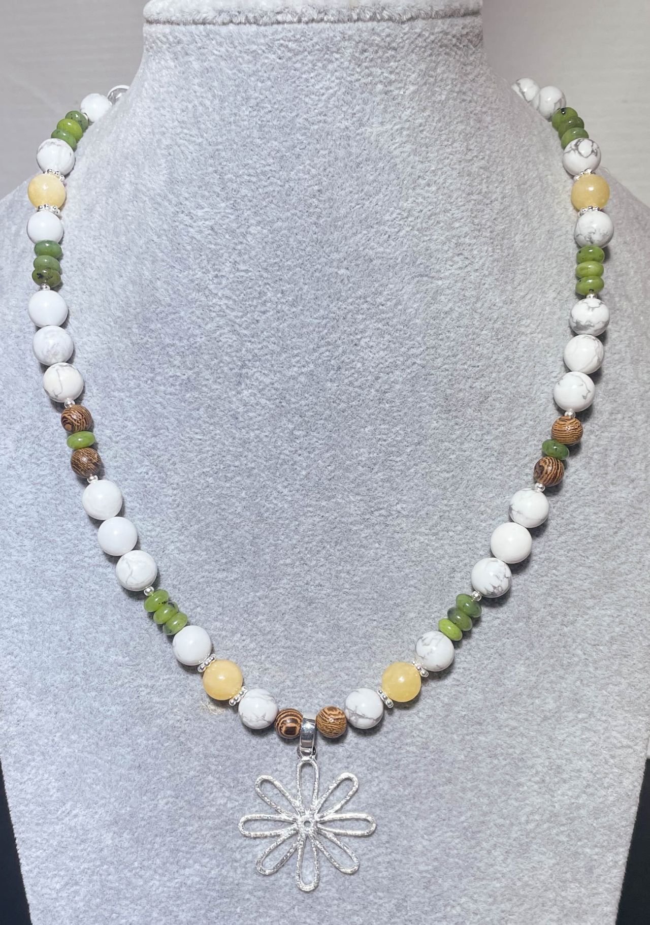 „Flower Power“ Edelstein-Collier aus Magnesit, Jade & Orangencalcit – handgefertigt mit 925er Silber