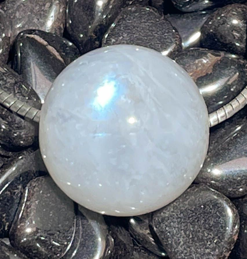 Dieser edle Regenbogenmondstein Kugel-Anhänger – auch weißer Labradorit genannt – fasziniert durch seinen zarten, irisierenden Schimmer, der im Licht in feinen Blau-, Silber- und Regenbogentönen erstrahlt.
