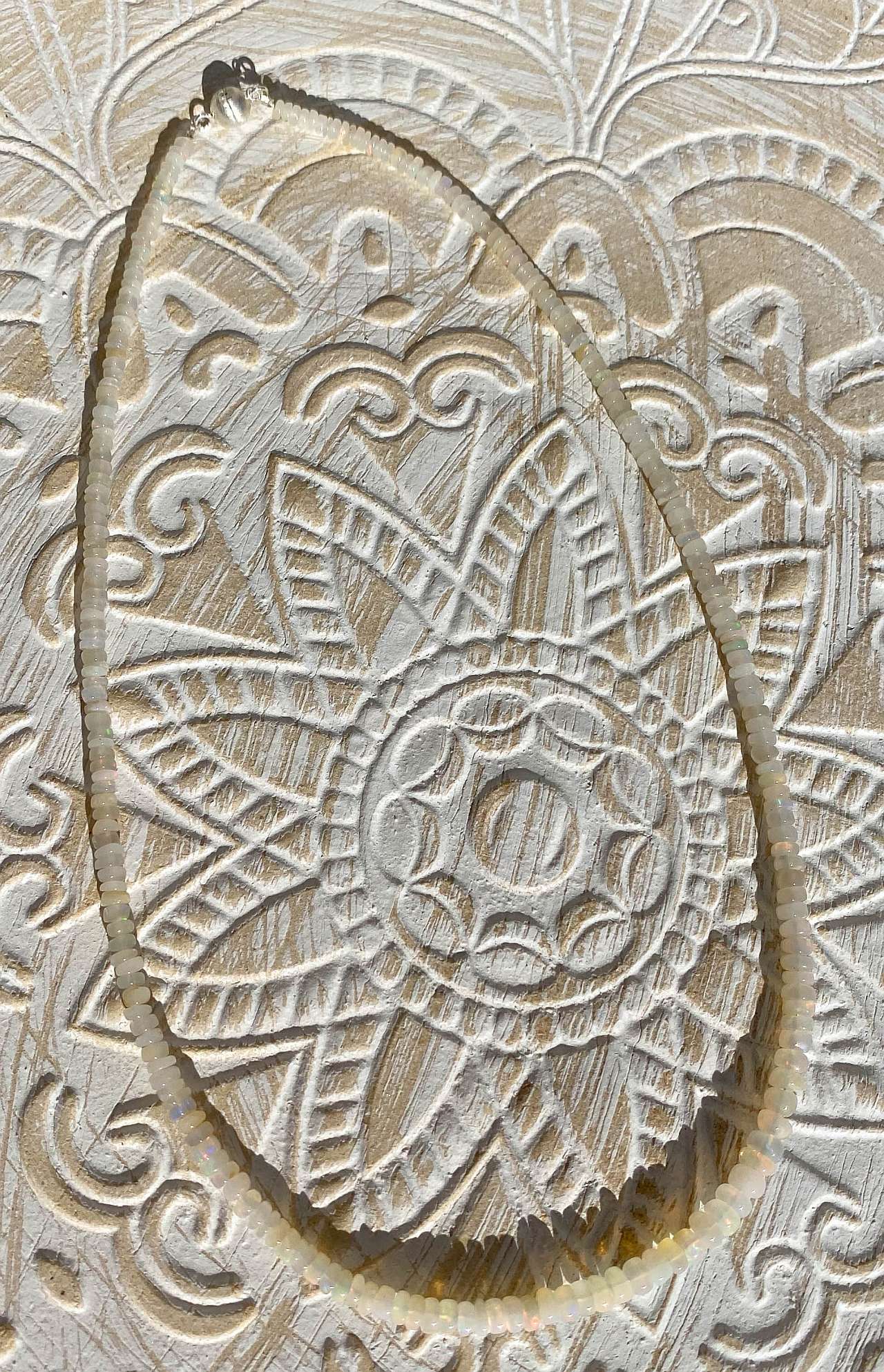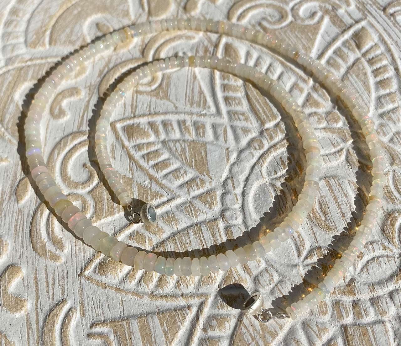 Dieses liebevoll handgefertigte Edelstein-Collier aus äthiopischem Welo-Opal besticht durch seine zarten Farbnuancen und das charakteristische, schillernde Farbspiel der Opale. Je nach Lichteinfall offenbaren die Rondelle aus äthiopischem Opal ein leuchtendes Spektrum von sanftem Grün, Gold, Rosa und Blau – ein wahrhaft magischer Anblick.