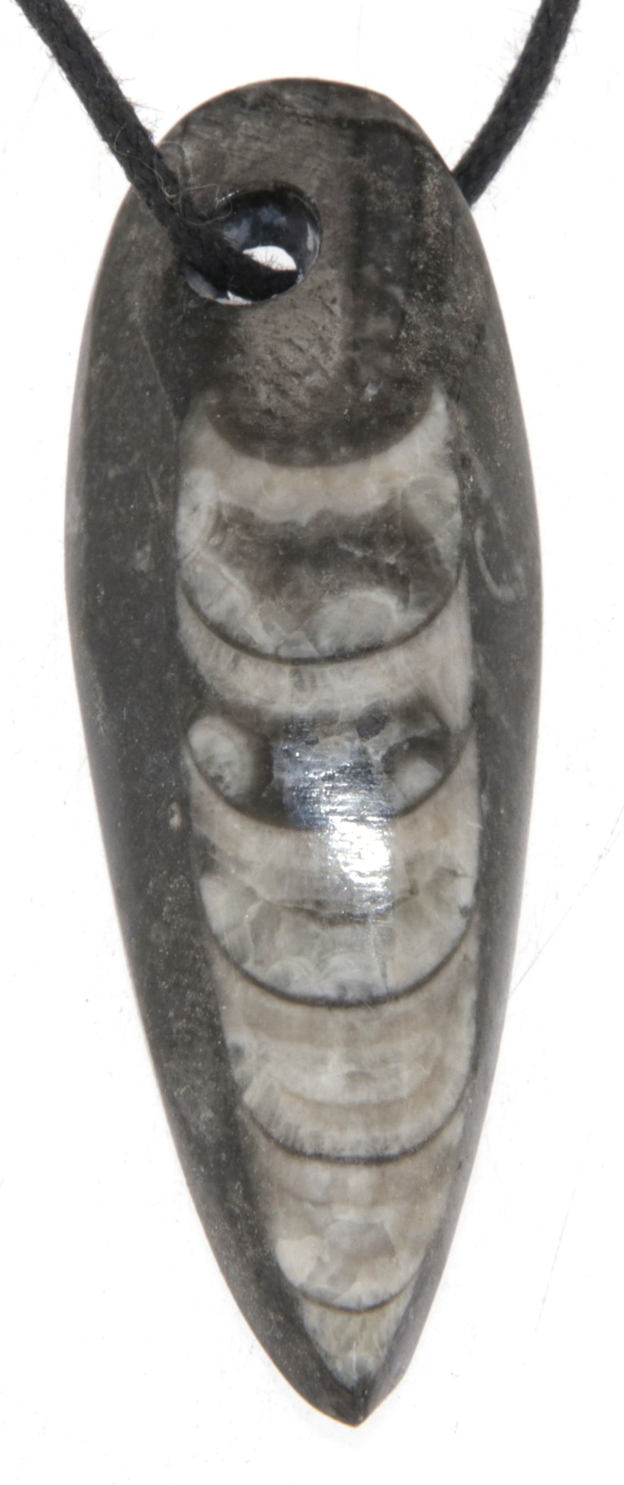 Du erhältst den abgebildeten Orthoceras-Anhänger – ein handpoliertes Schmuckstück mit faszinierendem fossilem Muster.