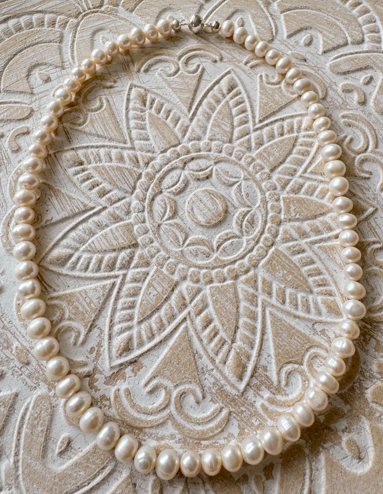 Dieses liebevoll handgefertigte Edelstein-Collier aus ovalen Süßwasserperlen (ca. 6 x 8 mm) verzaubert durch seinen sanften Glanz und die natürliche, leicht unregelmäßige Form jeder einzelnen Perle. Das feine Schimmern unterstreicht feminine Ausstrahlung und stilvolle Zurückhaltung – ein Symbol für Anmut und Harmonie.