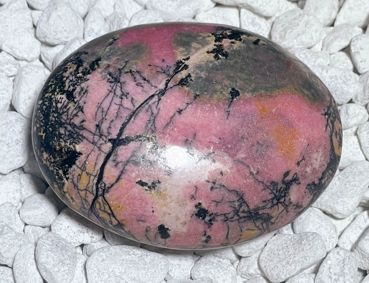 Ein edler Rhodonit Seifenstein in A-Qualität, fein geschliffen und poliert. Dieser wunderschöne Edelstein besticht durch seine natürliche rosa bis rotbraune Farbgebung mit markanten schwarzen Adern und Einschlüssen, die jedes Stück zu einem einzigartigen Natur-Unikat machen.