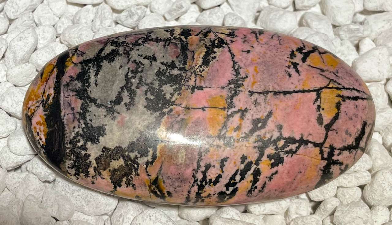 Ein eleganter Rhodonit Seifenstein in A-Qualität, fein geschliffen und sorgfältig poliert. Dieser Edelstein zeigt eine wunderschöne rosa bis rötliche Farbgebung mit charakteristischen schwarzen Adern und Einschlüssen, die ihm seine unverwechselbare, natürliche Maserung verleihen. Jeder Stein ist ein einzigartiges Natur-Unikat mit feiner Struktur und angenehmem Glanz.