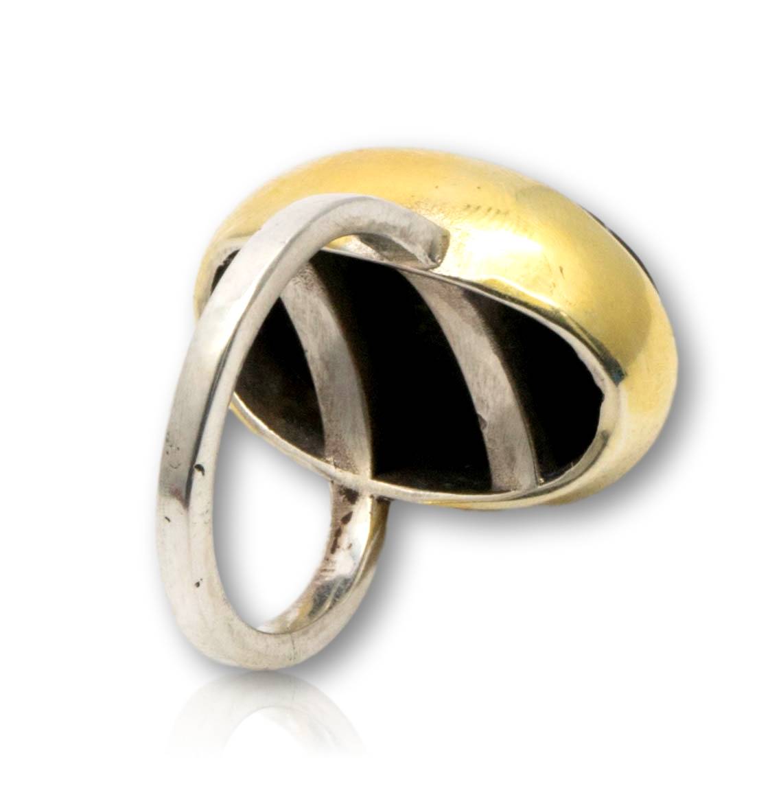 Der Ringkopf ist mit 24 Karat Gold vergoldet, wodurch der warme Goldton in harmonischem Kontrast zum dunklen Edelstein steht.