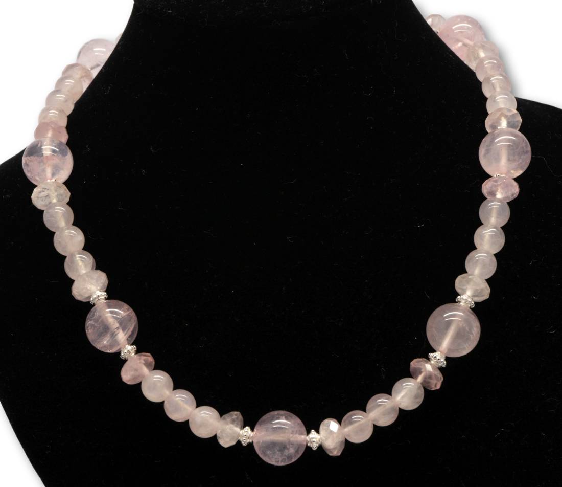 Ein Schmuckstück voller Sanftheit und Harmonie: Dieses handgefertigte Edelstein-Collier aus Rosenquarz bezaubert durch seine zarten Rosétöne und den seidigen Glanz der sorgfältig geschliffenen Edelsteinkugeln. Der Rosenquarz – bekannt als Stein der Liebe und des Herzens – steht für Sanftmut, Vertrauen und innere Ruhe und macht dieses Collier zu einem Symbol für Weiblichkeit und emotionale Stärke.