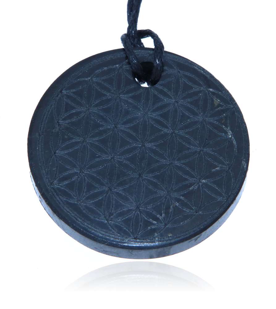 Edler Schungit Anhänger – Blume des Lebens graviert, mit Stoffband (35 mm)