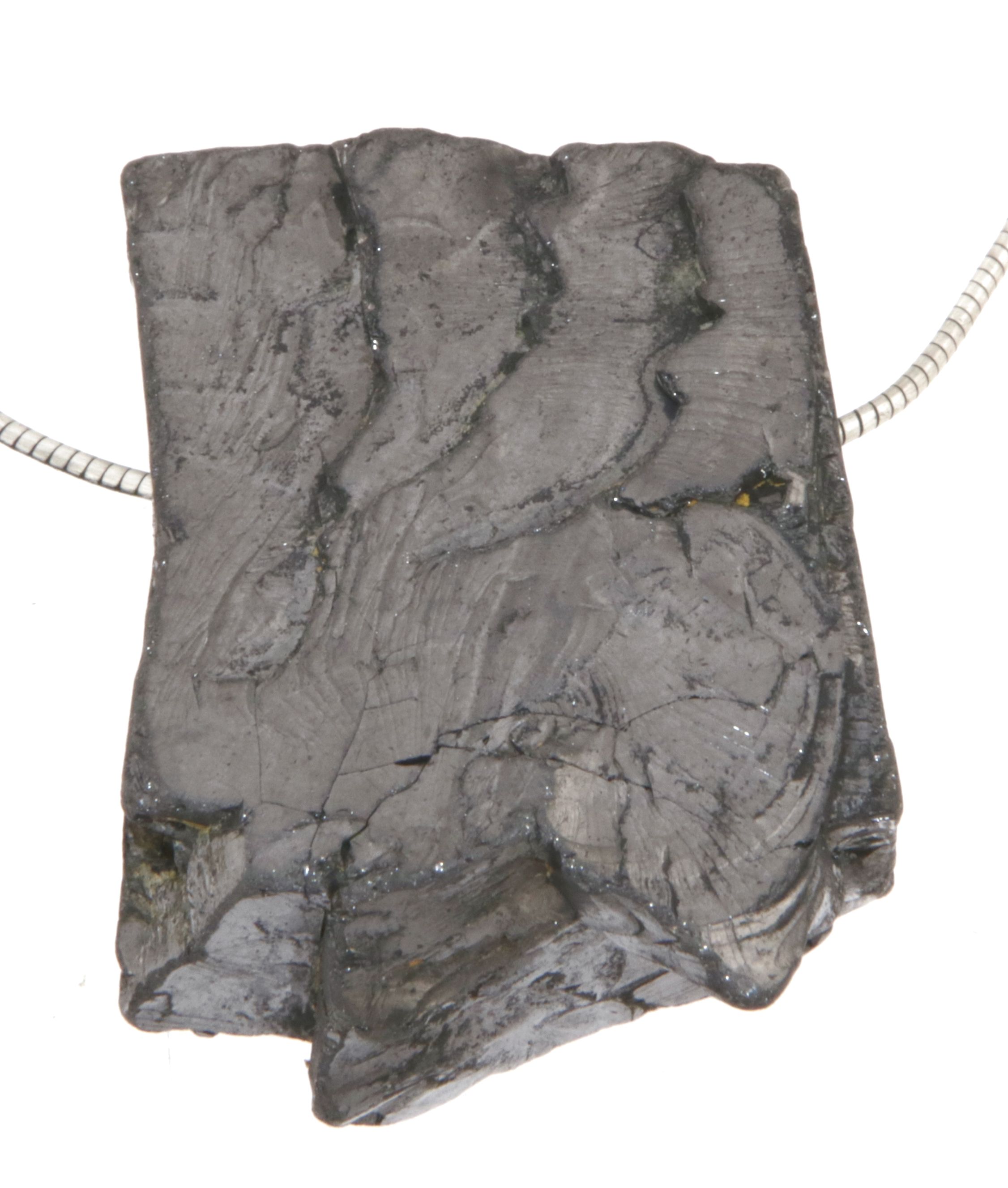 Dieser Anhänger aus Edelschungit besticht durch seine tiefschwarze Farbe, den metallischen Glanz und die feine, glatte Oberfläche.