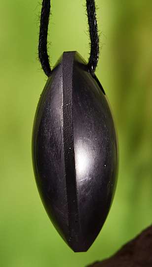 Ein edler Edelsteinanhänger aus echtem Schungit, in klassischer Linsenform geschliffen und handgefertigt.