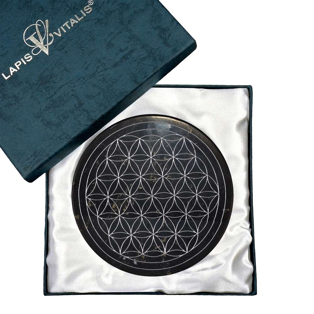 Schungit Scheibe „Blume des Lebens“ – silberfarben, in Geschenkschachtel (Ø ca. 9 cm)