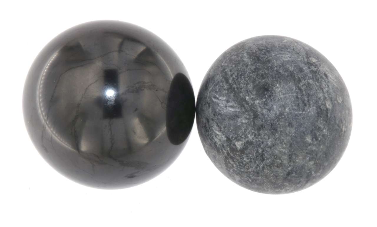 Eine Kugel besteht aus echtem Schungit, dem kraftvollen Schutzstein aus Karelien (Russland), der für Reinigung, Stabilität und Erdung steht.