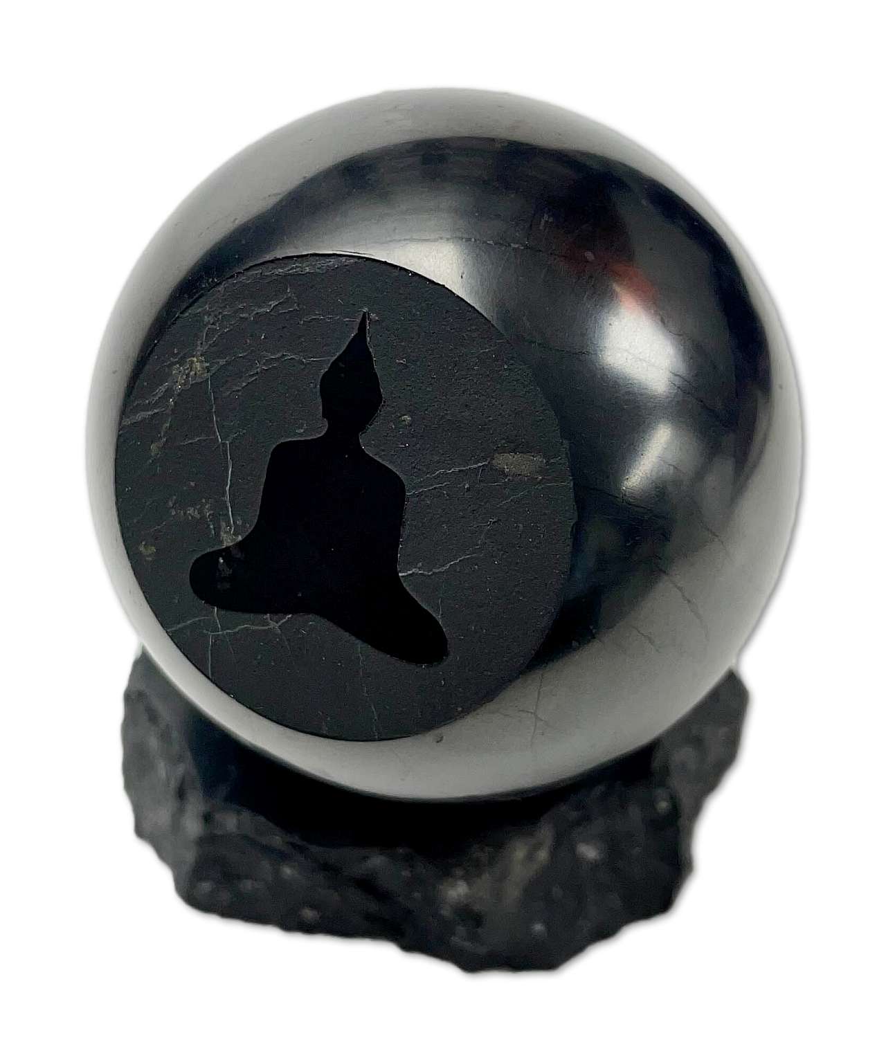 Eine edle Schungit Kugel mit fein eingraviertem Buddha-Motiv, gefertigt aus 100 % echtem Schungit aus Karelien.