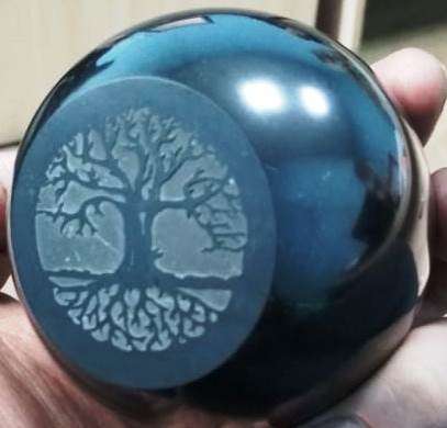 Eine edle Schungit Kugel mit fein eingraviertem Baum des Lebens, gefertigt aus 100 % echtem Schungit aus Karelien.
