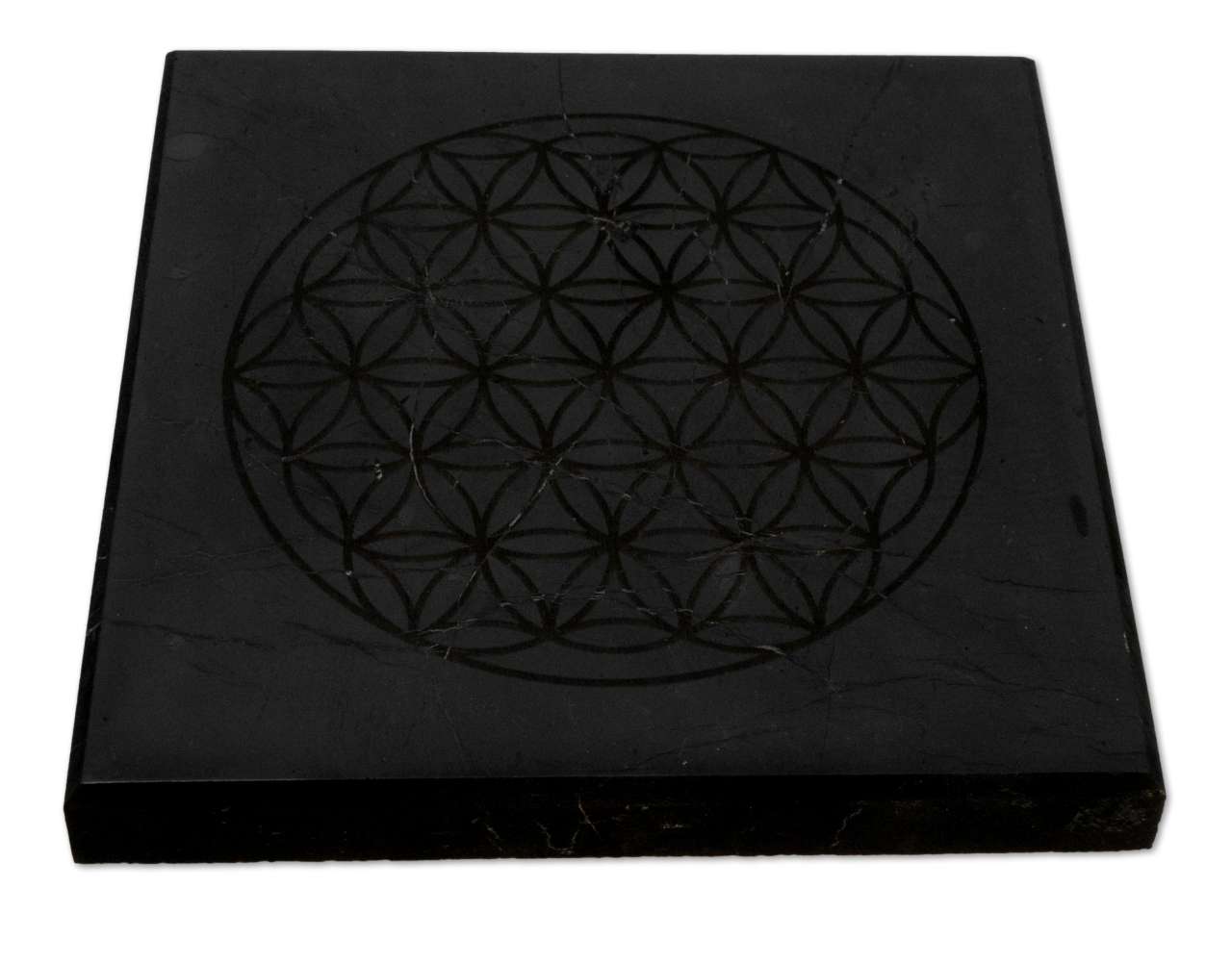 Eine edle Schungit Platte aus 100 % echtem Schungit aus Karelien, fein poliert und mit der „Blume des Lebens“ kunstvoll eingraviert.