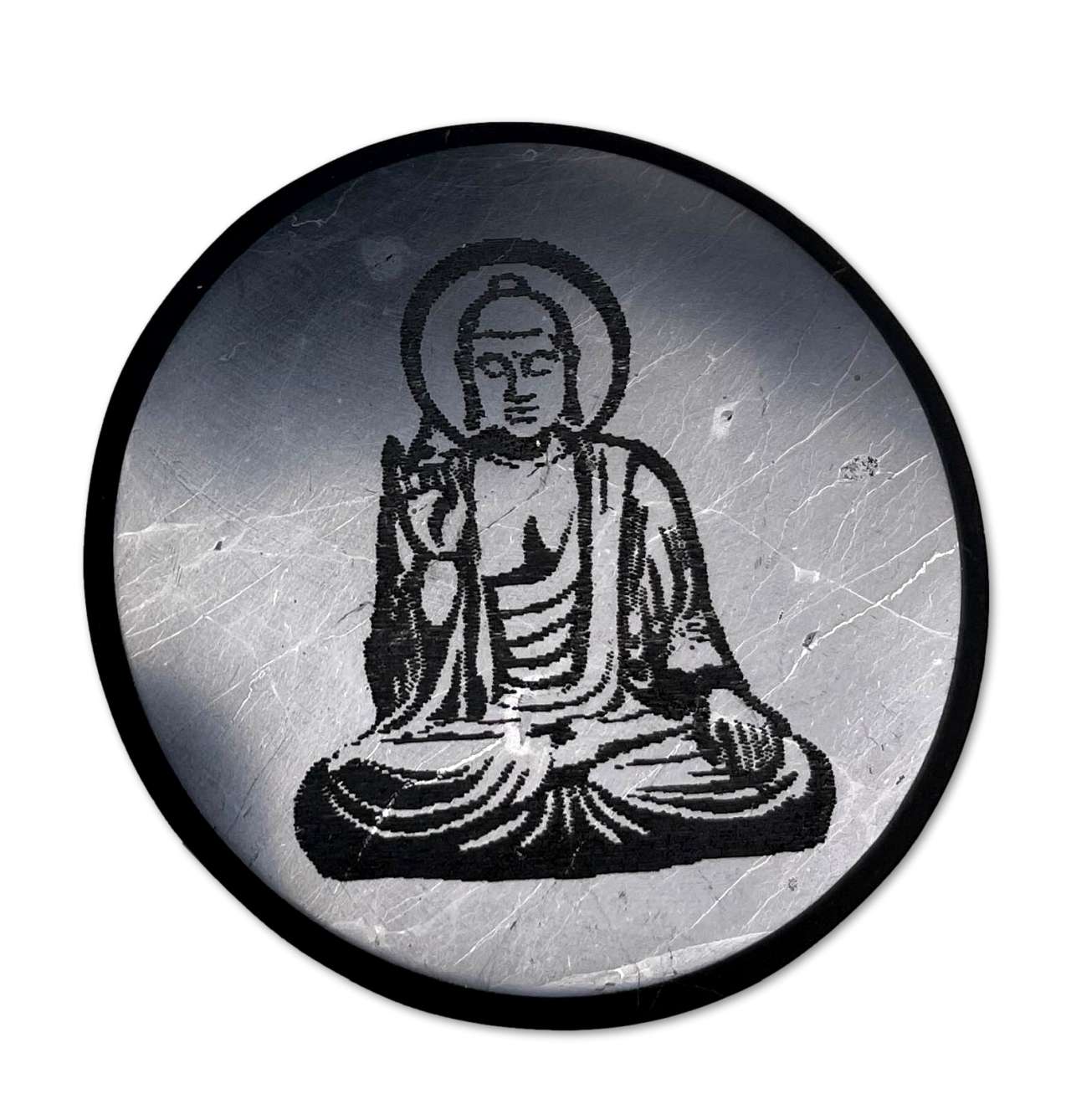 Eine edle Schungit Platte mit fein eingraviertem Buddha-Motiv, gefertigt aus 100 % echtem Schungit aus Karelien.
